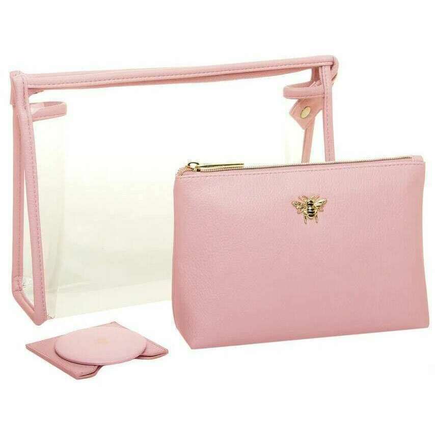 Perfect for women is this Alice Wheeler London pink 3 piece beauty gift set, it is also made from 100% vegan faux leather. It measures clear case: 21cm(height) x 21cm(width) x 8cm(depth) beauty case: 13.5cm(height) x 20cm(width) x 6cm(depth) compact: 7.4cm(height) x 8.2cm(width). It is recommended to wipe clean with damp cloth to keep this bag in good condition. All the bags come complete in alice wheeler london packaging. The Alice Wheeler London 3 Piece Beauty Gift Set - Pink will make a superb addition to your collection, giving you 2 storage cases and a handy compact mirror. The clear case is perfect for travelling while the stylish make-up bag will look elegant on your dresser and will keep all of your beauty products in one place. Both the make-up bag and compact are embellished with the beautifully iconic Honeybee. This set is perfect as a gift idea.