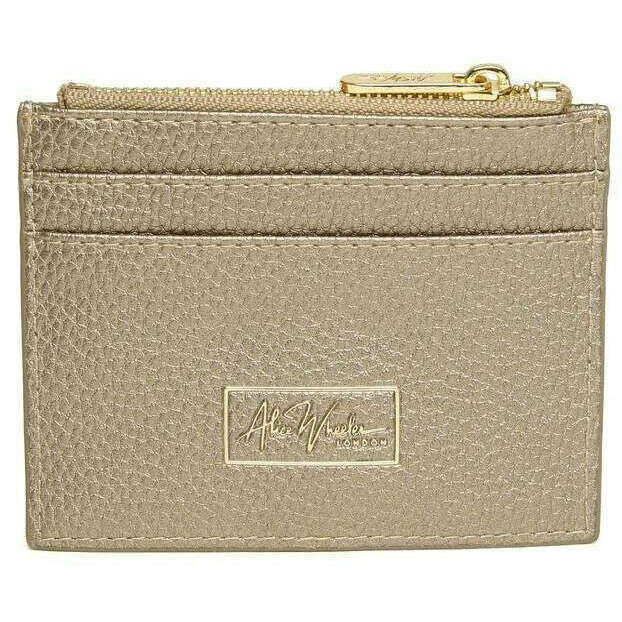 This women's barbican coin purse has been made from 100% vegan faux leather, featured in a bronze colour and is from the brand Alice Wheeler London. It measures 9cm(height) x 11.5cm(width). All the purses come complete with alice wheeler packaging. The Alice Wheeler London Barbican Coin Purse - Bronze is handy and a great way to organise your cards and cash. This purse features a main zippered compartment to store coins and notes and 2 card slots on the front and 2 on the back. Finishing off this purse is the Alice Wheeler bee logo adorned to the front. Made from high-quality vegan faux leather means that this purse is completely eco-friendly.