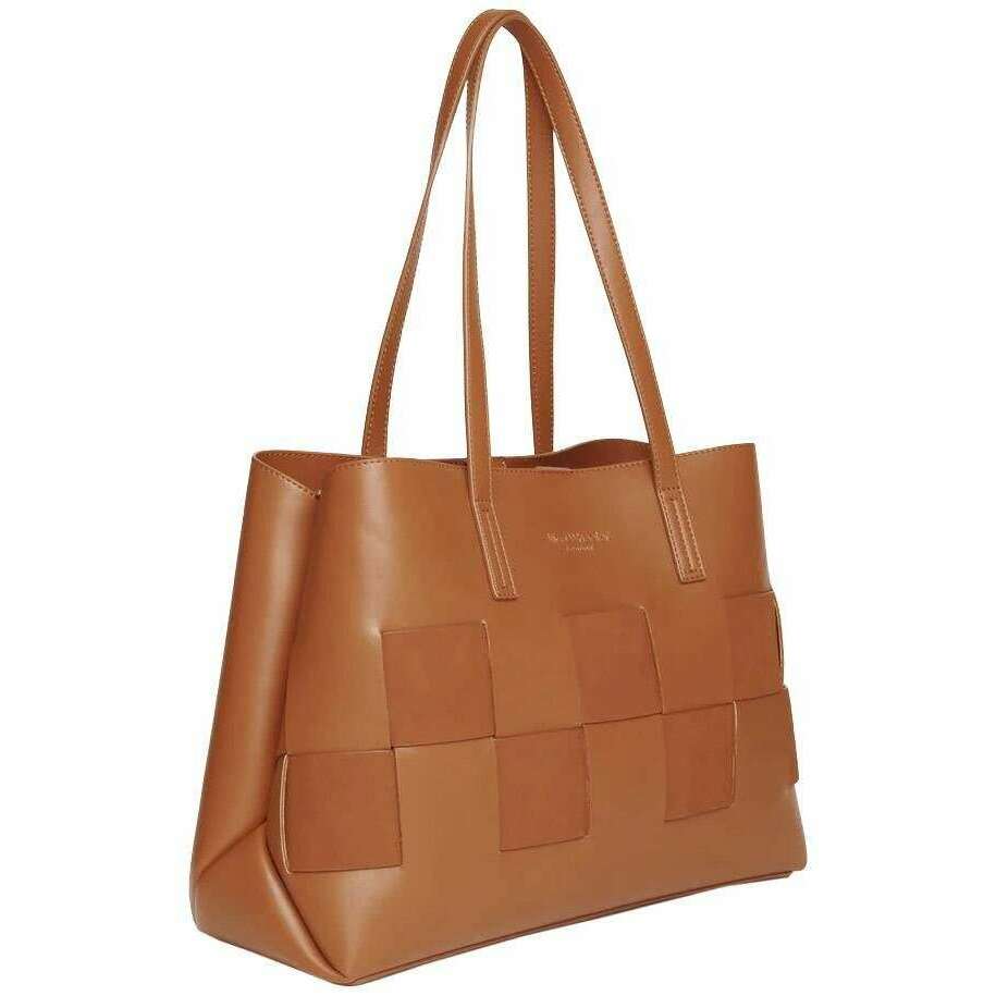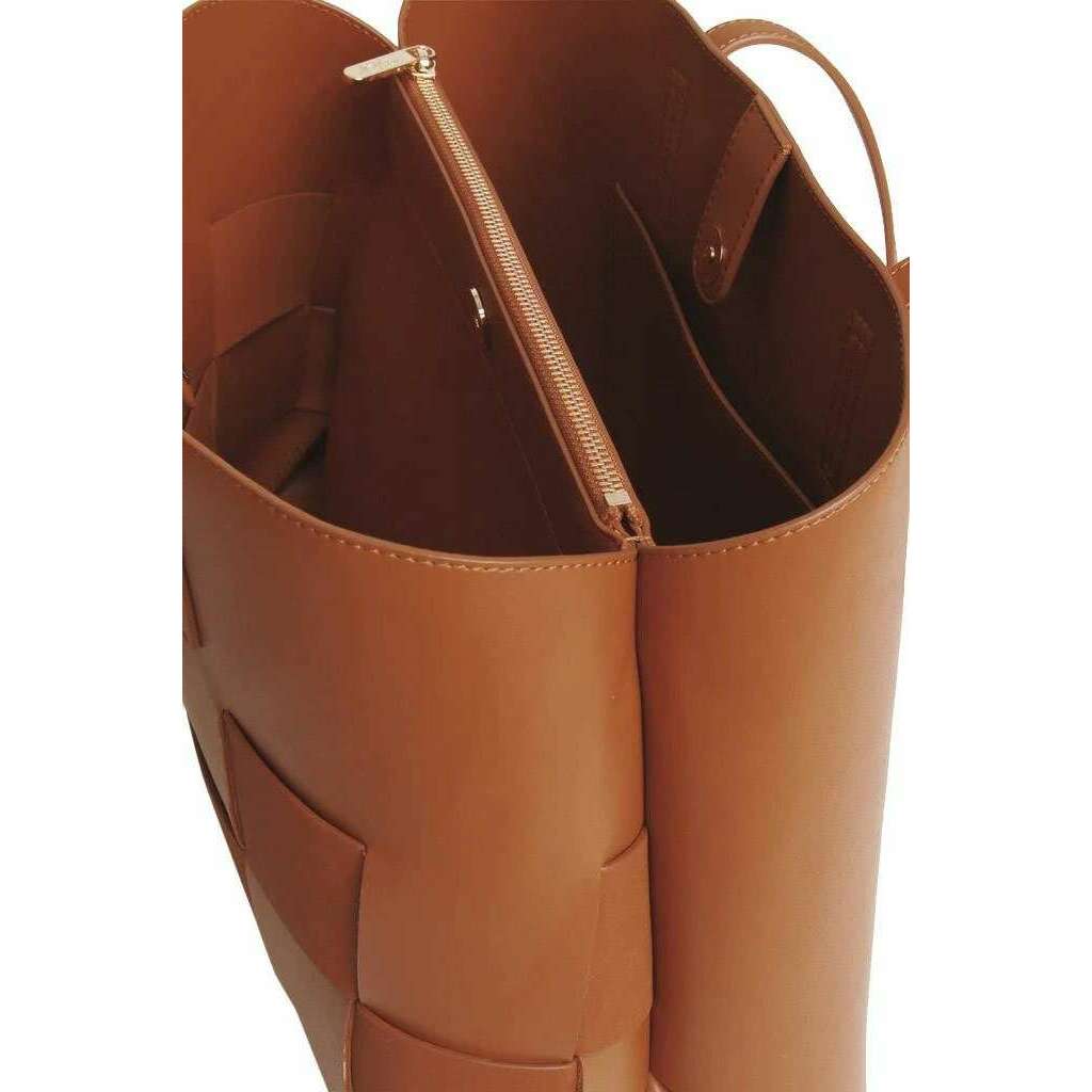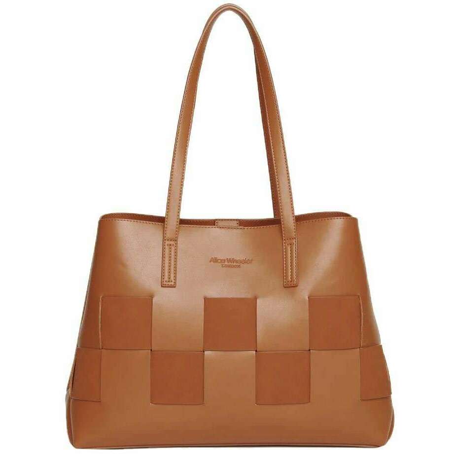 This women's milan tote bag by the brand Alice Wheeler London is made from 100% vegan faux leather and is showcased in tan. It measures 17cm(height) x 26cm(width) x 12cm(depth). All the bags come complete in alice wheeler london packaging. The Alice Wheeler London Milan Tote Bag - Tan will make the perfect chic accessory that you will want to bring along to any event. Its elegant weaving design on the front is a beautiful detail that will certainly get people’s attention. Inside is a double compartment with an integrated zipped section ensuring you have a space for your valuables as well as compartments with easy access for grab and go belongings like sunglasses or lipstick. It can also fit a small laptop. The double carry handles ensure easy carrying making it a must have piece.