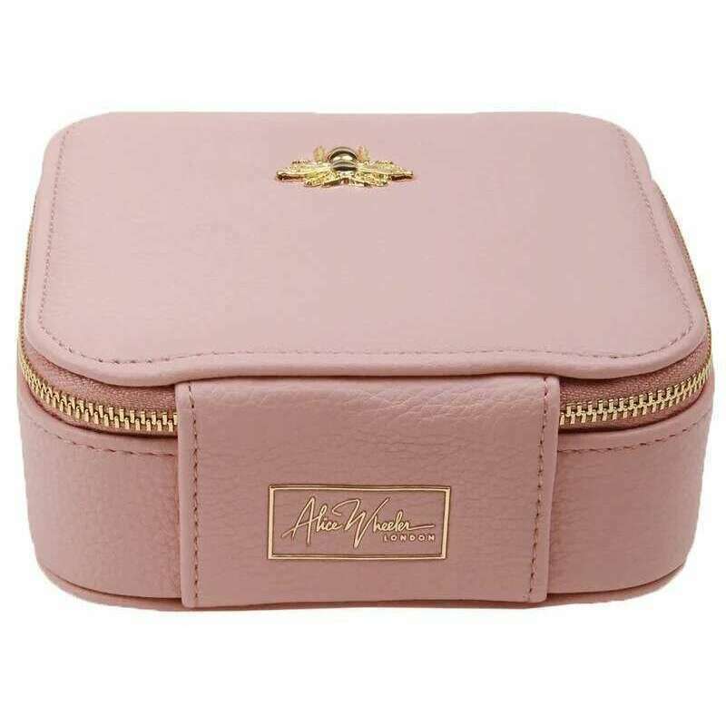Designer Alice Wheeler London has brought you this women's vegan faux leather and faux suede interior jewellery box using pink tones. It measures 13.5cm(height) x 13.5cm(width) x 5cm(depth). All the jewellery boxes come complete with alice wheeler packaging. The Alice Wheeler London Travel Jewellery Box - Pink will become an all-time favourite with its great organisation and perfect size to slip into any bag whatever the occasion. Featuring a ring roll great for earrings and your most worn rings, 3 small compartments for smaller pieces, 2 larger side compartments for necklaces and bracelets and a mirror on the lid. The gold-toned zipper closure offers security and luxury. Complete with the signature honeybee logo adorned to the top of this case.
