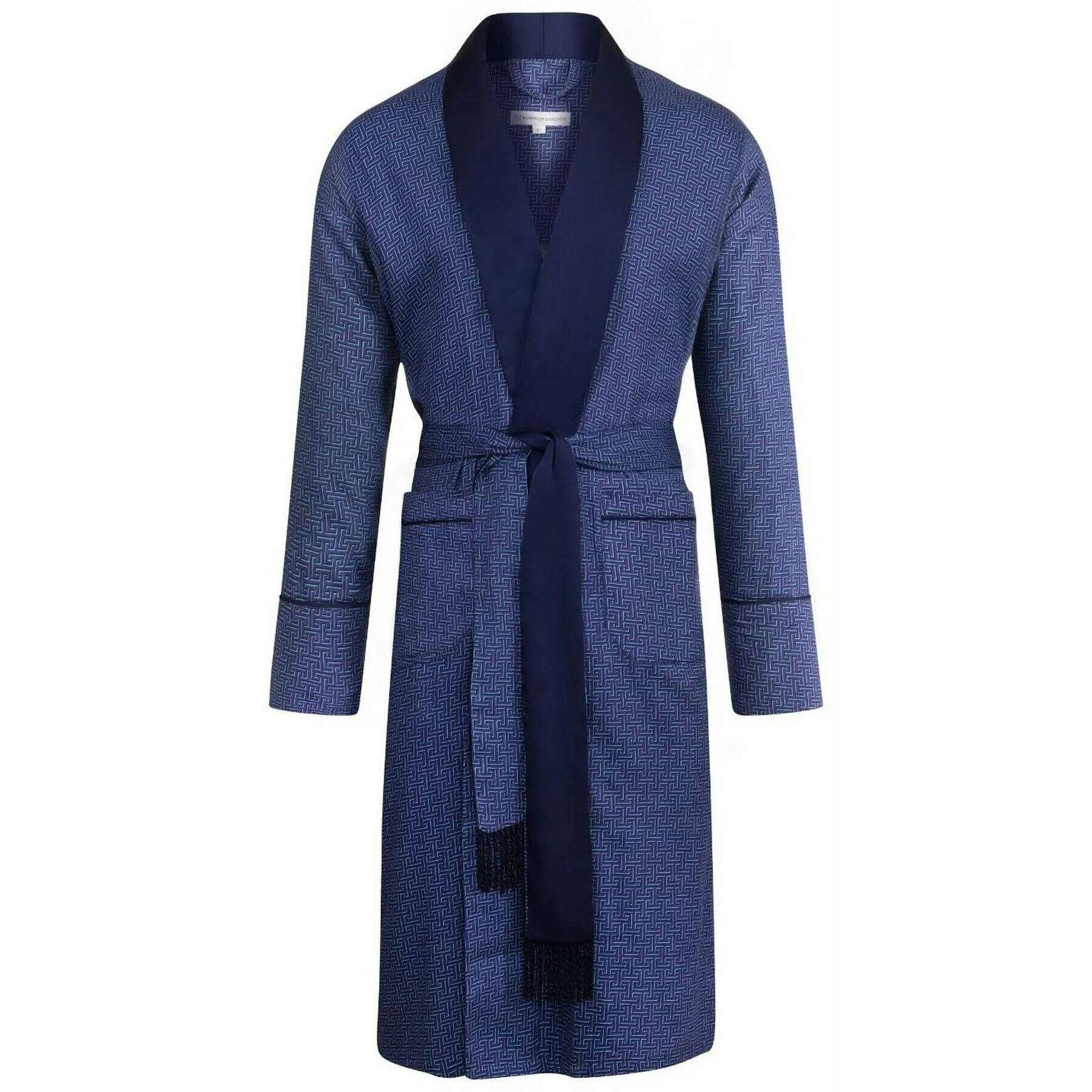 Introducing this men's oxford lightweight dressing gown by Bown of London, it is manufactured from 100% cotton, 200 gsm weight in a blue labyrinth colour. Also the blue labyrinth dressing gown is designed in a unique pattern, It is recommended to wash on a 40 degree cotton cycle to keep this dressing gown in good condition. All the dressing gowns come complete with bown of london dust bag. The Bown of London Oxford Lightweight Dressing Gown - Blue Labyrinth is beautifully crafted from the softest fabric to give you optimal comfort when relaxing. The satin shawl collar and lined cuffs contrast elegantly so you re sure to lounge in style. Featuring two front pockets and an adjustable belt, comfort and practicality is paramount. Luxuriously stylish, this robe is perfect for any gentleman.