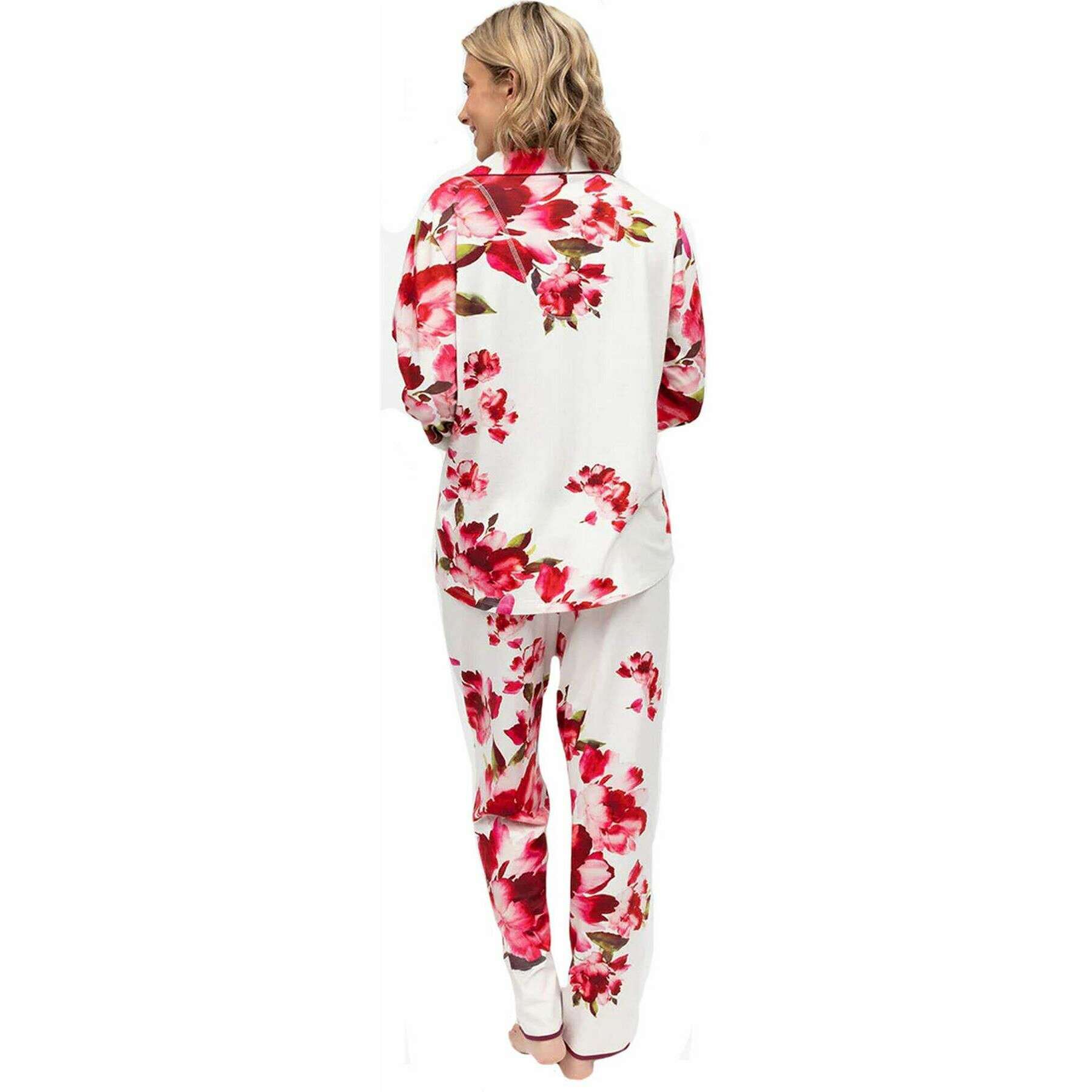 These women's isabella floral printed jersey pyjama set by the brand Cyberjammies are made from 52% cotton, 41% modal and 7% elastane and are showcased in pink. Also the ox blood burgundy/pink pyjamas are designed in a floral pattern, It is recommended to machine wash inside out, do not soak, wash with like colours to keep these pyjamas in good condition. All the pyjamas come complete with cyberjammies tags. The Cyberjammies Isabella Floral Printed Jersey Pyjama Set - Ox Blood Burgundy/Pink makes every moment of downtime feel special. Crafted from a soft jersey blend of cotton, modal, and elastane, this set offers the perfect balance of comfort and stretch. The top features a classic revere collar, oxblood piping, and covered buttons for a tailored finish, while the matching bottoms include an elasticated waistband, drawstring tie, and side pockets for ease. Finished with a delicate red floral print on fresh white fabric, this set is ideal for sleep or lounging in style.