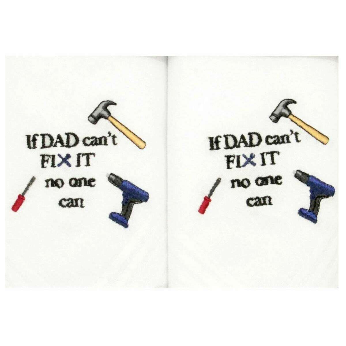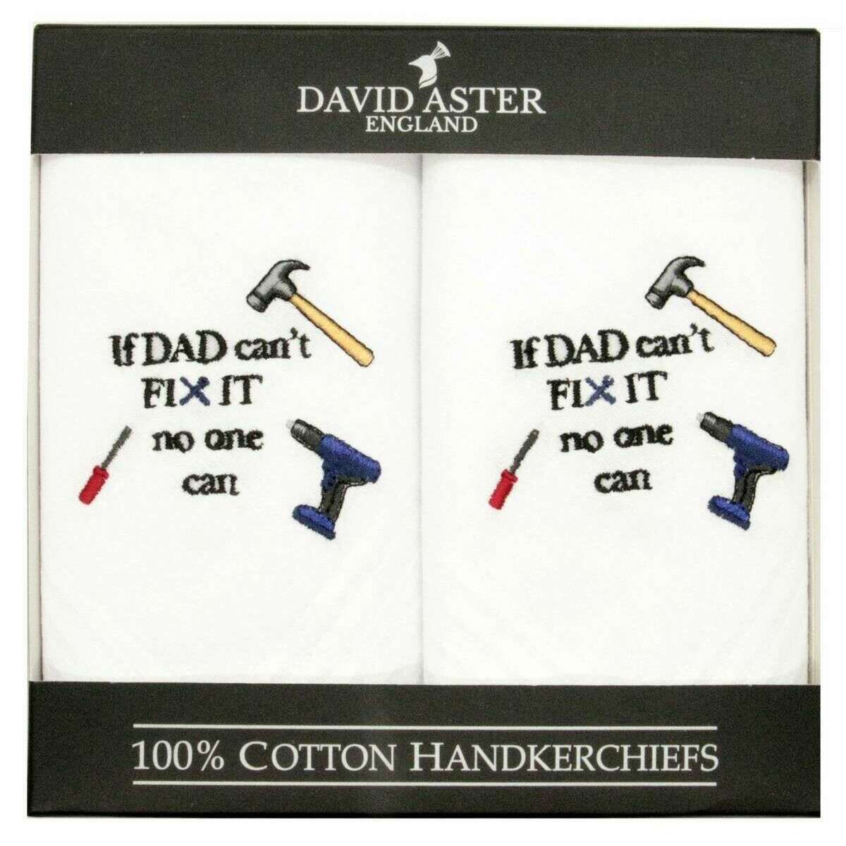 This well made men's diy embroidered handkerchiefs from David Aster comes in a white colour and is manufactured from 100% cotton . 2 pack handkerchiefs are value for money ensuring they are a good buy, All the handkerchiefs come complete with a david aster presentation box. The David Aster DIY Embroidered Handkerchiefs - White is a stunning pack to own with it featuring a Dad DIY phrase on each with a white background. Certain to impress, this will be guaranteed to give your attire the perfect finishing trendy look due to its personalised design making you stand out from the crowd. Make this a great gift to any Dad who loves to DIY.