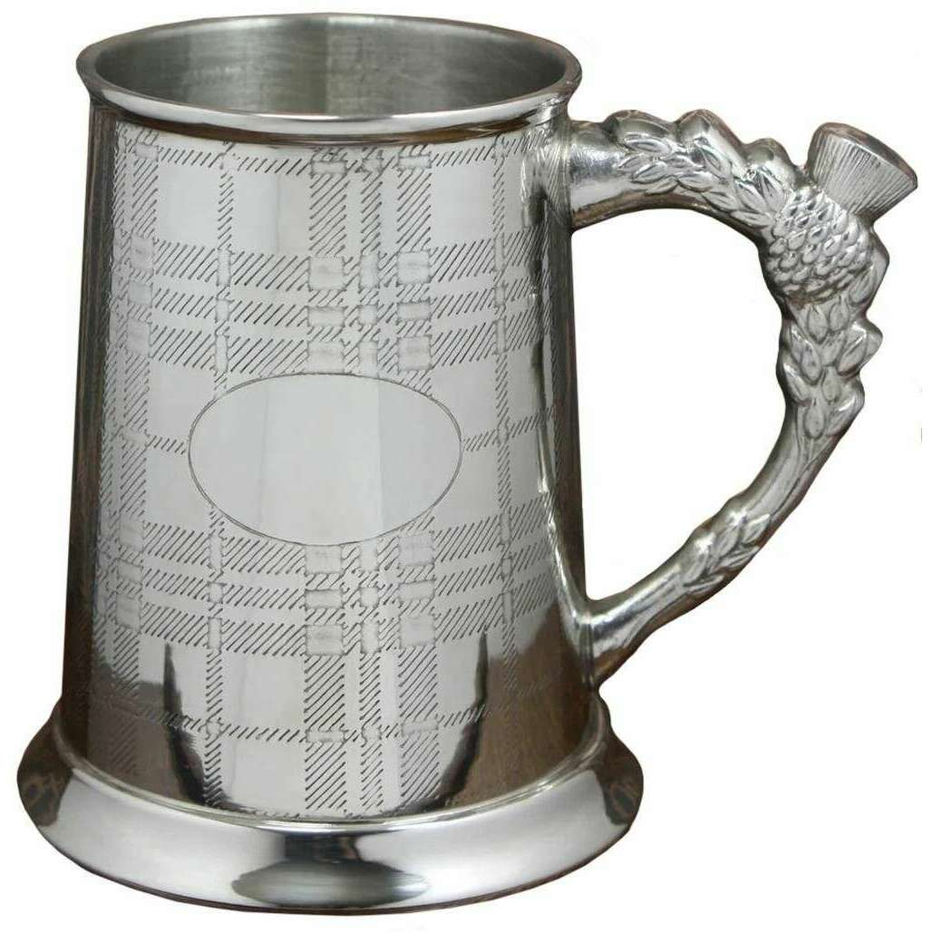 This unisex 1pt tartan tankard has been made from pewter, featured in a silver colour and is from the brand English Pewter Company. It measures 12.75cm(height). All the drinkware and glassware comes complete in a english pewter company gift box. The English Pewter Company 1pt Tartan Tankard - Silver will make the perfect gift for someone special or to add to your drinkware. It features a sturdy handle with an intricate design and offer classic appeal with its weighty finish. Fill it up with your favourite ale or craft beer and raise a toast for the special occasion. The high quality material ensures it gives off timeless charm.