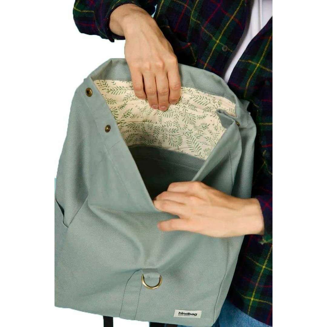 Brought to you by the brand Hindbag, this sage green unisex guillaume flap backpack is made from 100% organic cotton (500g/m2). It measures 48cm(height) x 30cm(width) x 15cm(depth). All the bags come complete with hindbag packaging. The Hindbag Guillaume Flap Backpack - Sage Green is a sleek yet practical everyday companion, designed with equal attention to style, durability, and sustainability. Crafted from thick, GOTS-certified organic cotton, this bag features a spacious main compartment that can comfortably house a 15-inch laptop, books, or daily essentials, and a series of smaller interior pockets to keep your belongings neatly organized. The adjustable handles with foam will offer you comfort and robustness, making this backpack versatile enough for both professional and casual settings.