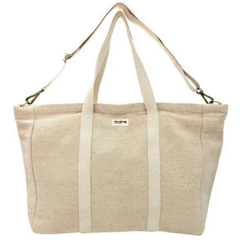 This unisex jean weekend bag has been made from 100% organic cotton, featured in a cream colour and is from the brand Hindbag. It measures 38cm(height) x 60cm(width) x 16cm(depth). All the bags come complete with hindbag tags. The Hindbag Jean Weekend Bag - Jute Cream is a great choice for travel as its large main section is nice and spacious, giving you the room for overnight necessities. It is fitted with two carry handles and a shoulder strap that can be adjusted to suit. Inside it also has a pocket for smaller items like your keys or phone. Crafted from thick, resistant organic cotton which is labelled GOTS meaning the production and transformation processes respect the environment and respect and improve working conditions. The lining is decorated with an elegant pattern, giving the bag some stylish flair.