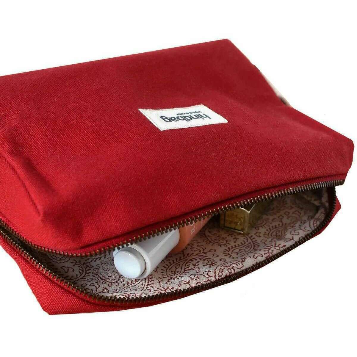 Introducing this unisex leon toiletry bag by Hindbag, it is manufactured from 100% organic cotton in a terracotta red colour. It measures 16cm(height) x 22cm(width) x 8cm(depth). All the bags come complete with hindbag packaging. The Hindbag Leon Toiletry Bag - Terracotta Red is a sleek and practical accessory designed for travellers and daily commuters who value both style and functionality. The practical handle ensures easy handling, and the secure zipper closure keeps your essentials safe. Lined with matching organic cotton in a block print pattern, this bag offers ample space for your toiletries without being bulky.