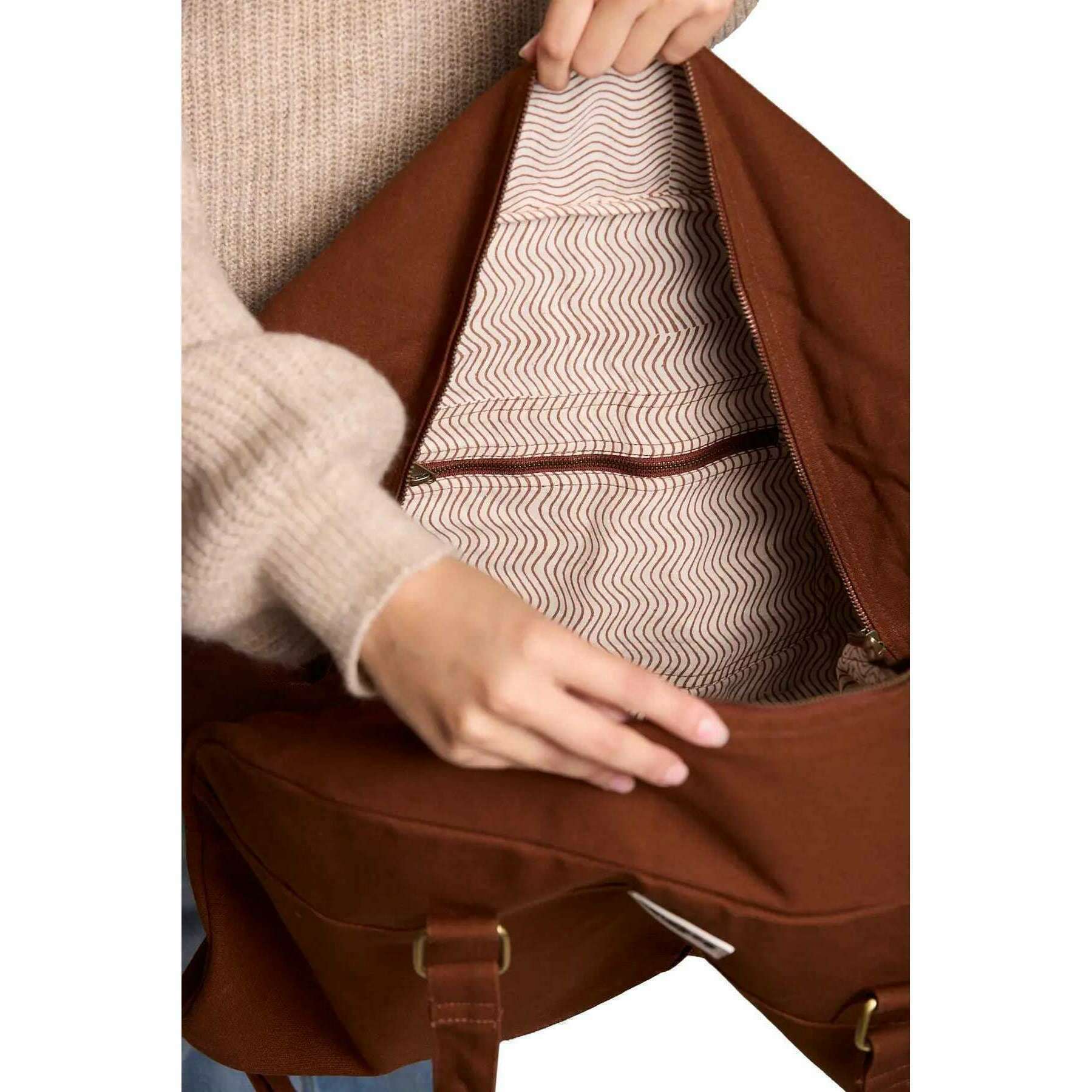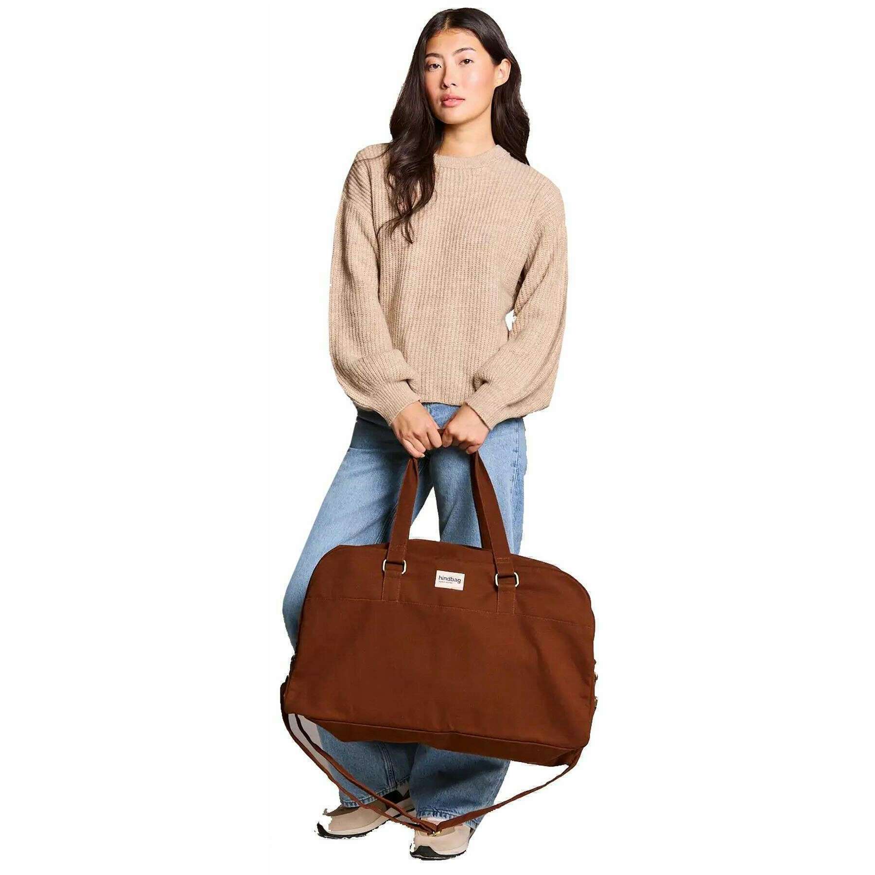 This unisex yves large travel bag has been made from 100% organic cotton, featured in a brown colour and is from the brand Hindbag. It measures 33cm(height) x 54cm(width) x 24cm(depth). All the bags come complete with hindbag packaging. The Hindbag Yves Large Travel Bag - Chocolate Brown is a spacious and eco-friendly option for travellers. Crafted from thick, GOTS-certified organic cotton, this bag features multiple pockets for organization, a secure zipper closure, and a printed inner lining that adds a touch of elegance. With its handles and large adjustable shoulder strap, this bag can be easily carried by hand or on the shoulder.