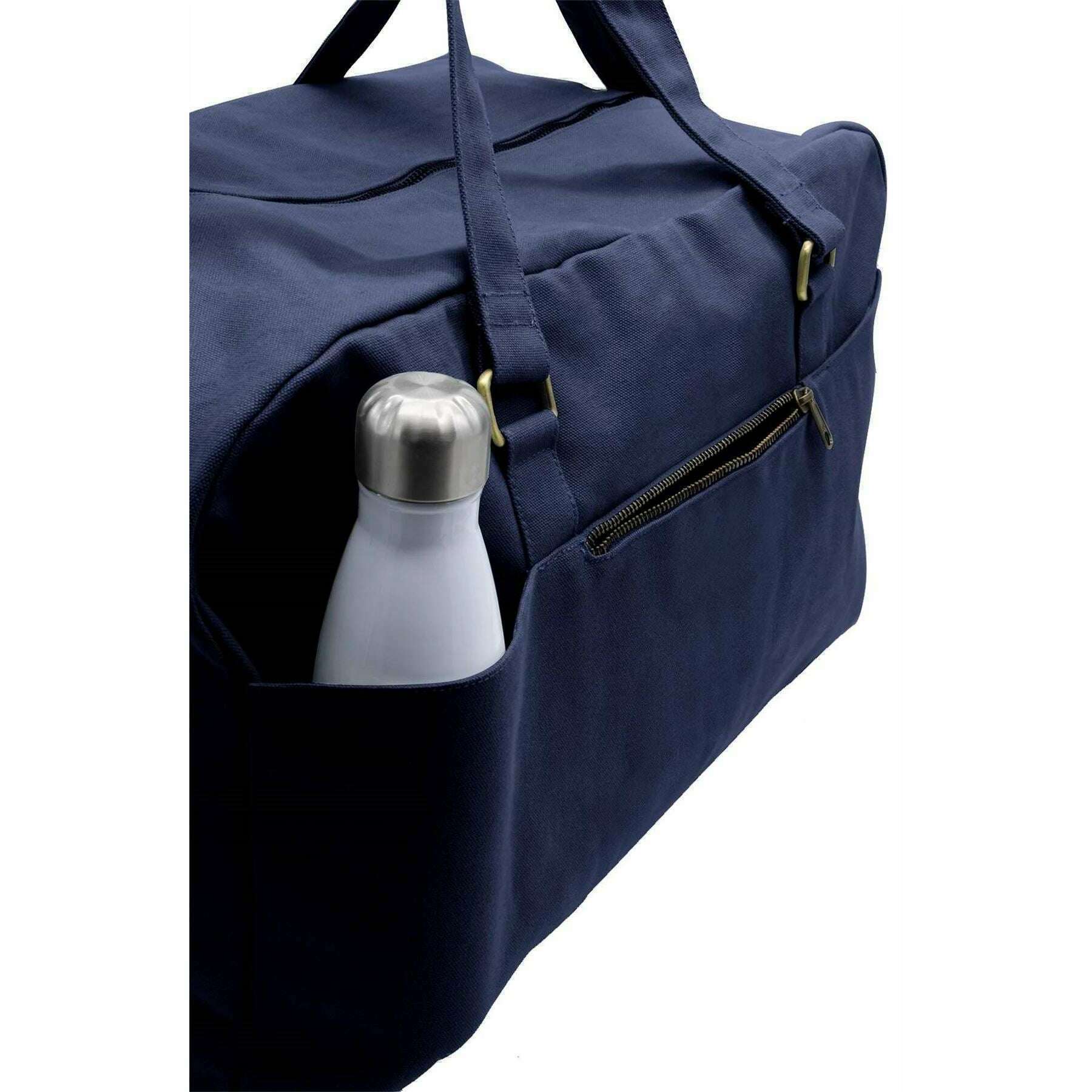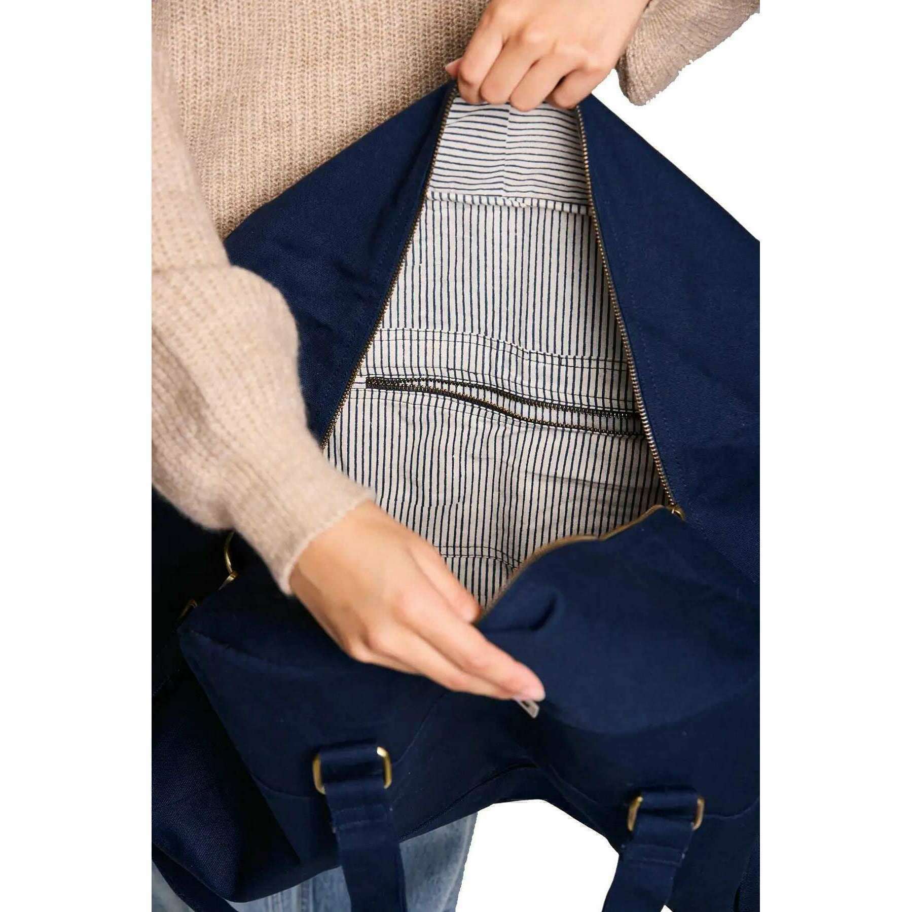 This yves large travel bag for men or women is fashioned by the brand Hindbag in a blue colour and is made from 100% organic cotton. It measures 33cm(height) x 54cm(width) x 24cm(depth). All the bags come complete with hindbag packaging. The Hindbag Yves Large Travel Bag - Navy Blue is a spacious and eco-friendly option for travellers. Crafted from thick, GOTS-certified organic cotton, this bag features multiple pockets for organization, a secure zipper closure, and a printed inner lining that adds a touch of elegance. With its handles and large adjustable shoulder strap, this bag can be easily carried by hand or on the shoulder.