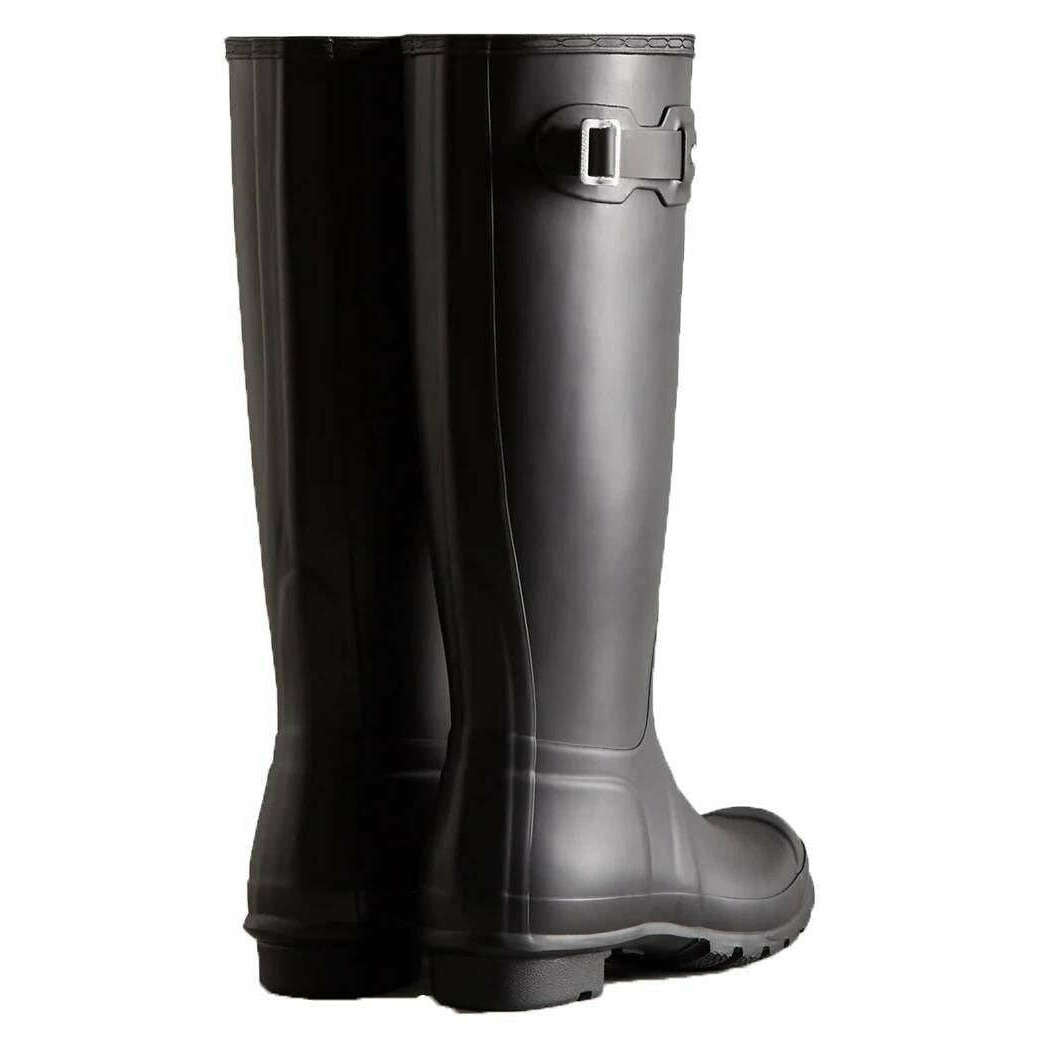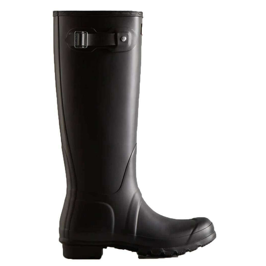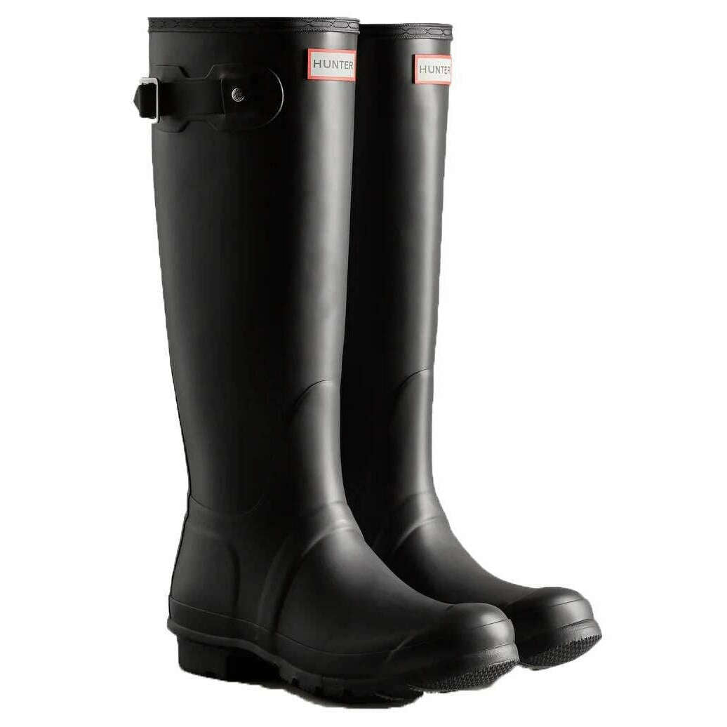 This women's original tall wellington boots by the brand Hunter is made from 100% rubber and is showcased in black. All the wellington boots come complete with hunter packaging. The Hunter Original Tall Wellington Boots - Black is a core style in the Hunter collection, offering reliable protection since its introduction in 1956. Each pair is handcrafted from 28 hand?cut natural rubber parts, assembled over three days on a bespoke aluminium last, and vulcanised for superior waterproof performance. Designed with a matte finish, the boot includes the Hunter Original tread pattern along with an updated recycled polyester lining and insole for added comfort. Specially engineered to repel water and prevent moisture penetration, this certified vegan boot is an essential choice for wet?weather wear.