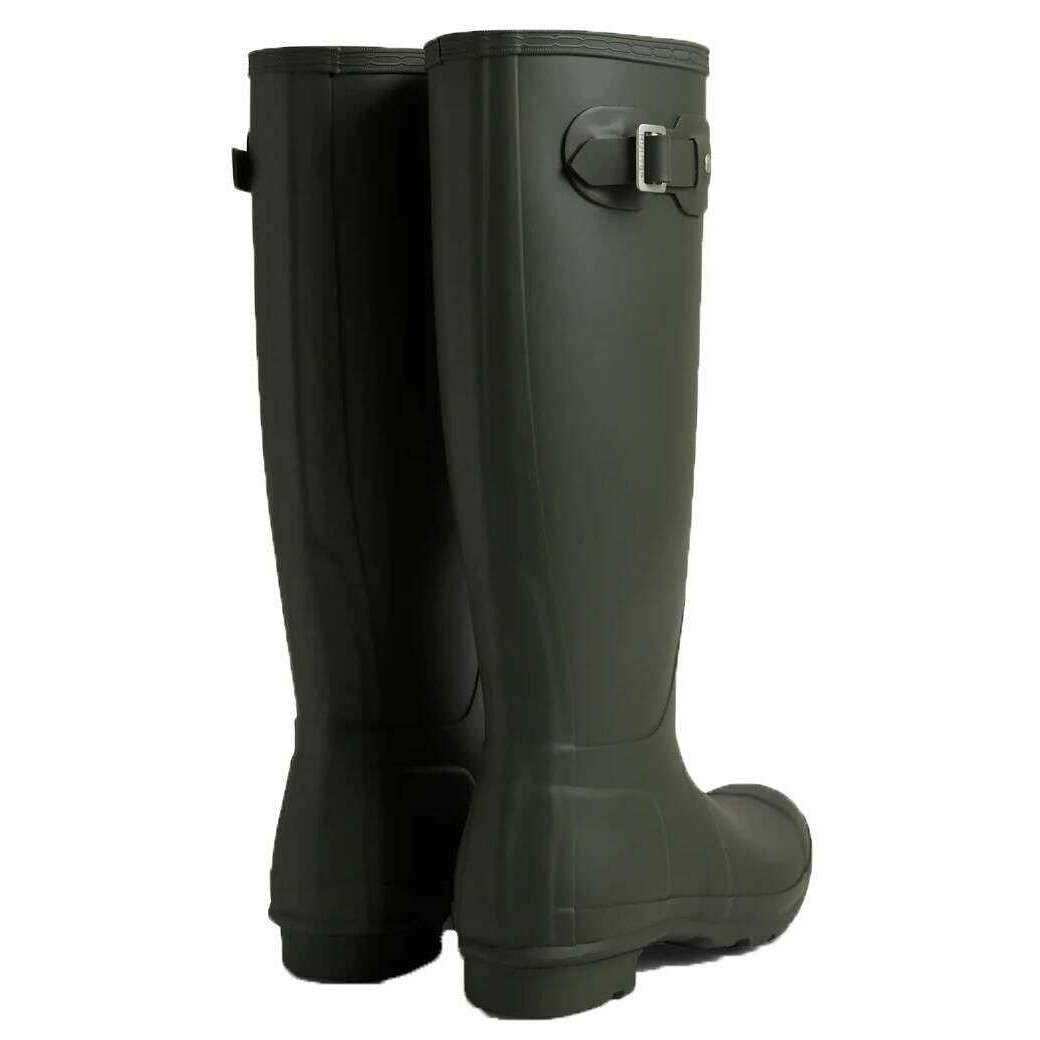 Manufactured from 100% rubber is this dark olive women's original tall wellington boots by the designer Hunter. All the wellington boots come complete with hunter packaging. The Hunter Original Tall Wellington Boots - Dark Olive is a core style in the Hunter collection, offering reliable protection since its introduction in 1956. Each pair is handcrafted from 28 hand?cut natural rubber parts, assembled over three days on a bespoke aluminium last, and vulcanised for superior waterproof performance. Designed with a matte finish, the boot includes the Hunter Original tread pattern along with an updated recycled polyester lining and insole for added comfort. Specially engineered to repel water and prevent moisture penetration, this certified vegan boot is an essential choice for wet?weather wear.