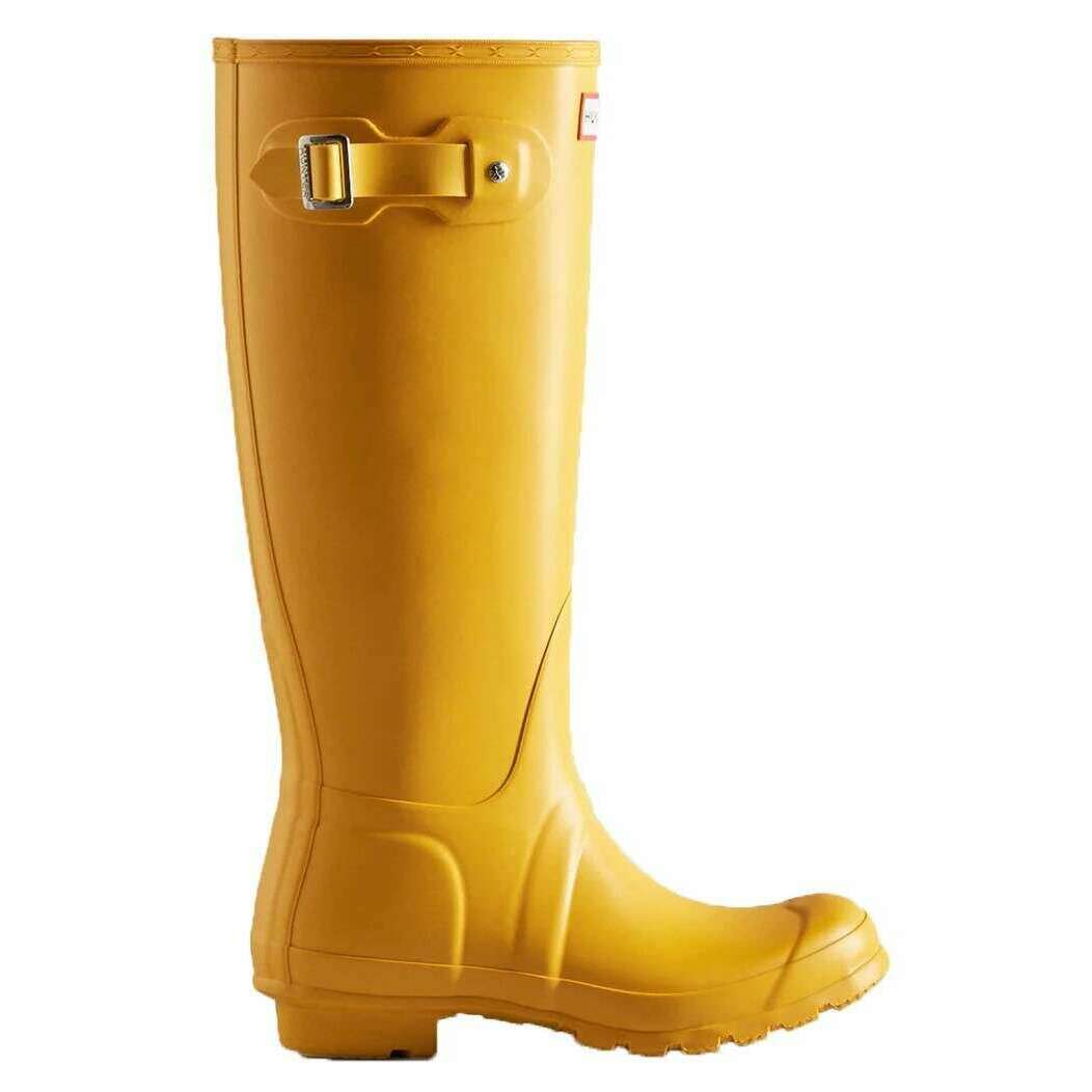 This women's original tall wellington boots has been made from 100% rubber, featured in a yellow colour and is from the brand Hunter. All the wellington boots come complete with hunter packaging. The Hunter Original Tall Wellington Boots - Yellow is a core style in the Hunter collection, offering reliable protection since its introduction in 1956. Each pair is handcrafted from 28 hand?cut natural rubber parts, assembled over three days on a bespoke aluminium last, and vulcanised for superior waterproof performance. Designed with a matte finish, the boot includes the Hunter Original tread pattern along with an updated recycled polyester lining and insole for added comfort. Specially engineered to repel water and prevent moisture penetration, this certified vegan boot is an essential choice for wet?weather wear.