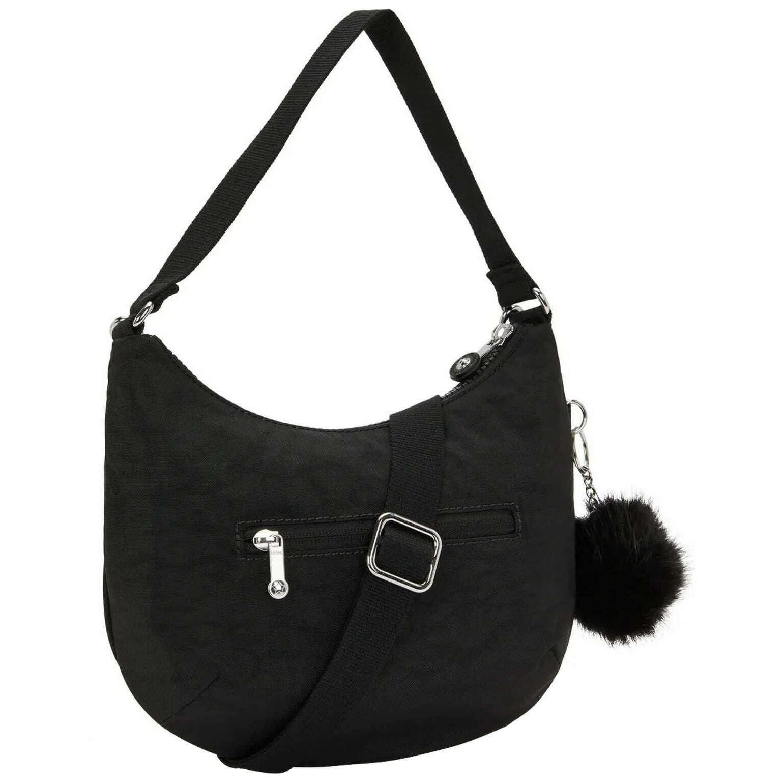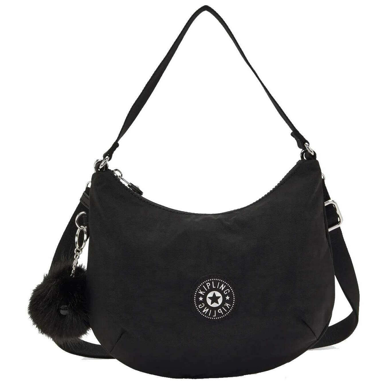 This women's amani shoulder bag by the brand Kipling is made from 100% recycled polyester and is showcased in black. It measures 22cm(height) x 26.5cm(width) x 10cm(depth). All the bags come complete with kipling packaging. The Kipling Amani Shoulder Bag - Black GG F25 is a chic, crescent-shaped shoulder bag designed for modern, everyday use. Featuring an internal zip pocket and a back zip pocket to secure all your items, this shoulder bag offers two strap options, a short shoulder strap and a longer adjustable and removable strap so you can wear it as a shoulder bag or sling crossbody. The signature monkey keychain adds a playful touch to this bag.