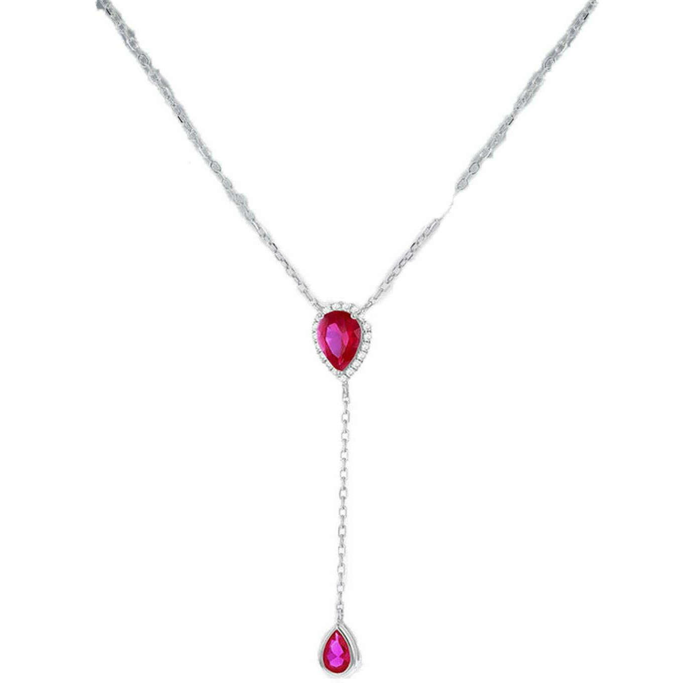 This women's teardrop adjustable lariat necklace by the brand KJ Beckett is made from sterling silver and is showcased in red. All the necklaces come complete with packaging. The KJ Beckett Teardrop Adjustable Lariat Necklace - Silver/Red makes a bold statement! Featuring a sparkling teardrop pendant adorned with brilliant red and white cubic zirconia, this elegant necklace lariat style allows you to customize the length for layered looks or a perfect neckline fit. Ideal for special occasions, evening wear, or as a striking gift, this necklace combines contemporary style with timeless sparkle.