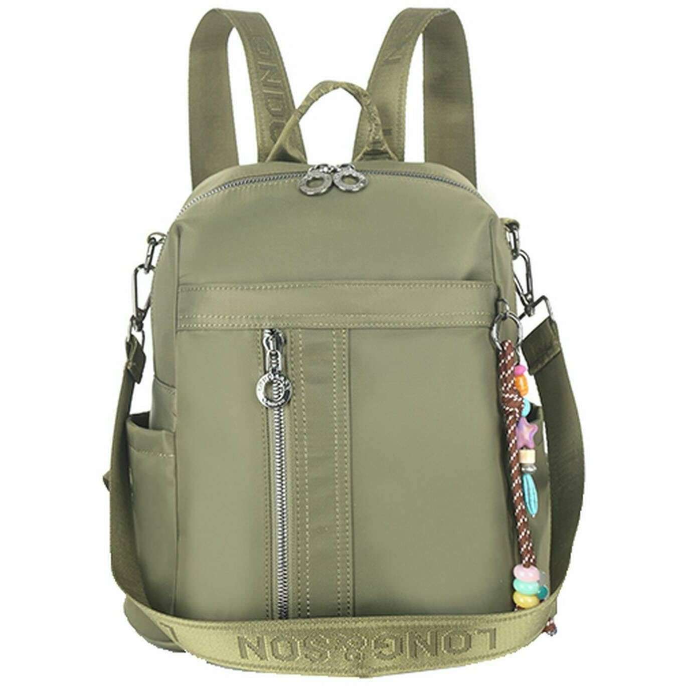 This well made women's shoulder backpack from Long and Son comes in a green colour and is manufactured from 100% polyurethane. It measures 30cm(height) x 29cm(width) x 12cm(depth). All the bags come complete with long & son packaging. The Long and Son Shoulder Backpack - Green modern and stylish is a must if you are looking for a bag to travel everywhere with you. Perfectly sized to carry all your essentials and more whilst not being overly sized and bulky. Featuring two front zipper pockets, two side open pockets, a back zipper pocket, and multiple interior pockets ensures great storage and organisation for all of your bits and bobs. To top it all this bag not only features adjustable branded back straps but also a branded detachable shoulder strap for a versatile wear. Complete with detachable charms on the front.