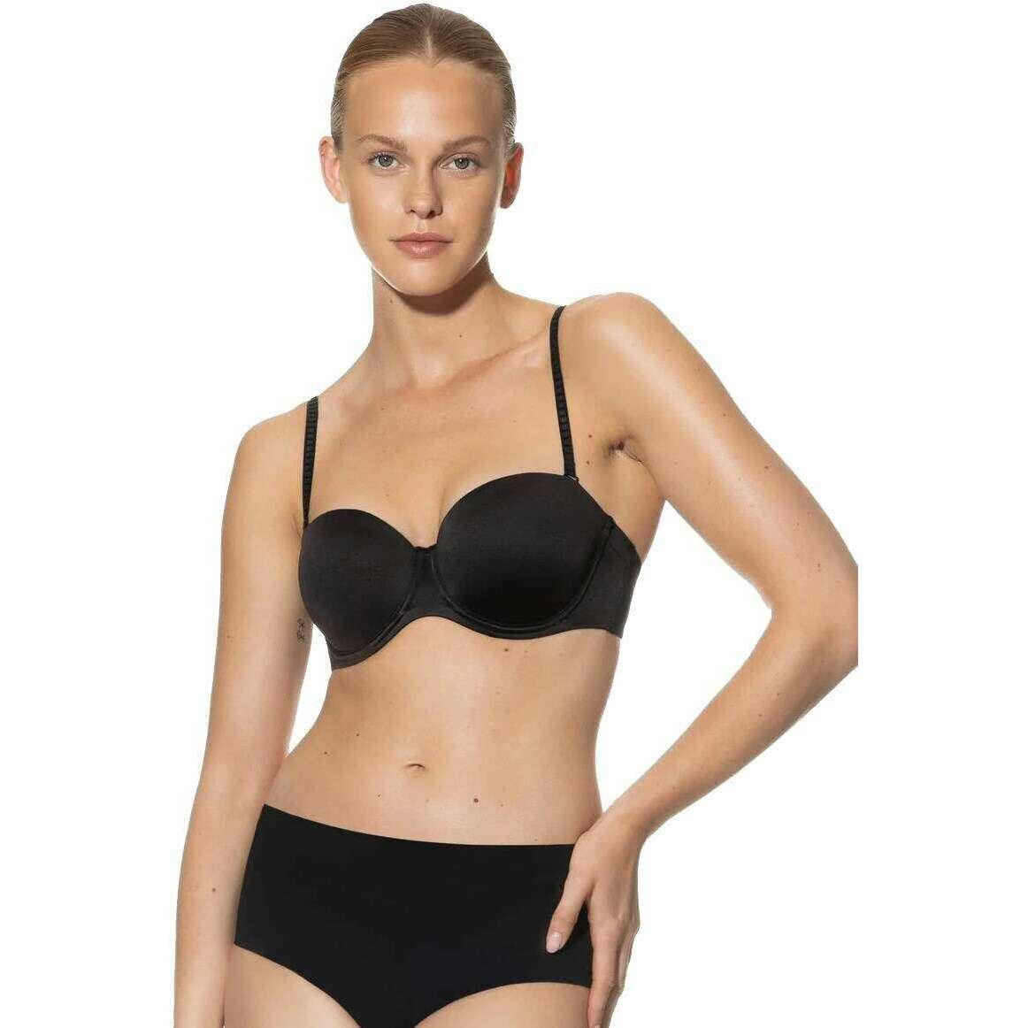 Introducing this women's joan multiway bra by Mey, it is manufactured from 77% polyamide and 23% elastane in a black colour. Also the black underwear is designed in a plain pattern, It is recommended to hand wash to keep this underwear in good condition. All the underwear comes complete in mey packaging. The Mey Joan Multiway Bra - Black has lined cups for subtle support as well as underwire and adjustable straps all in place to keep the girls in place while you are going about your day while also ensuring you are comfortable. This bra can be worn with or without the straps, offering you a strapless look if need, ensuring it has you covered no matter the outfit. Secured with a hook and eyelet fastening this is a functional and stylish wear.