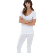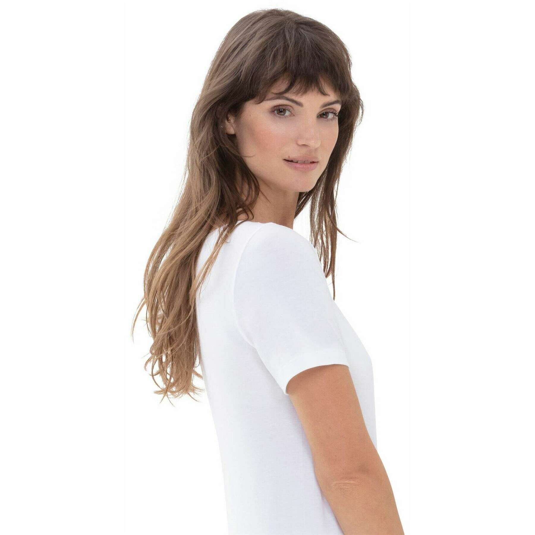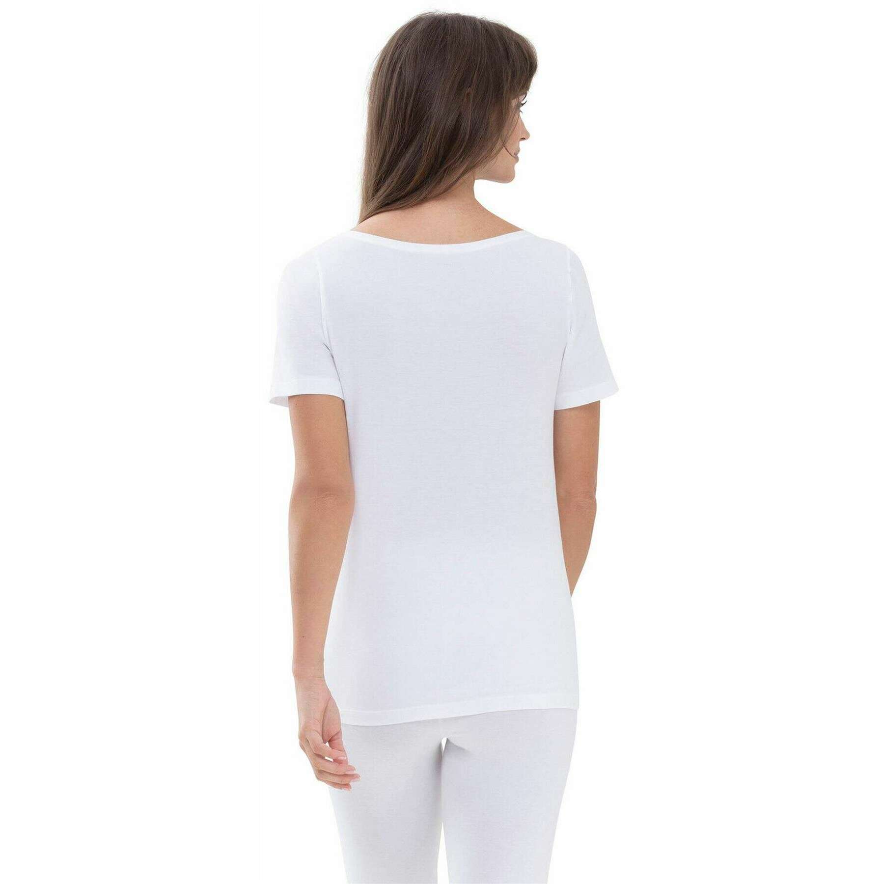 This women's superfine organic short-sleeved top has been made from 92% organic cotton and 8% elastane, featured in a white colour and is from the brand Mey. Also the white t-shirt is designed in a plain pattern, It is recommended to machine wash at 40 degrees to keep this t-shirt in good condition. All the t-shirts come complete with mey packaging. The Mey Superfine Organic Short-Sleeved Top - White is a must-have in any woman s collection. Features a low v neckline and a slim fit providing a simple and classic design. Crafted from a high proportion of cotton ensures this top is skin-friendly and breathable, perfect for anyone. This top is Oeko-Tex-Standard 100 and GOTS (global organic textile standard) certified and has sustainable factors that include resource-friendly materials and short transport distances.