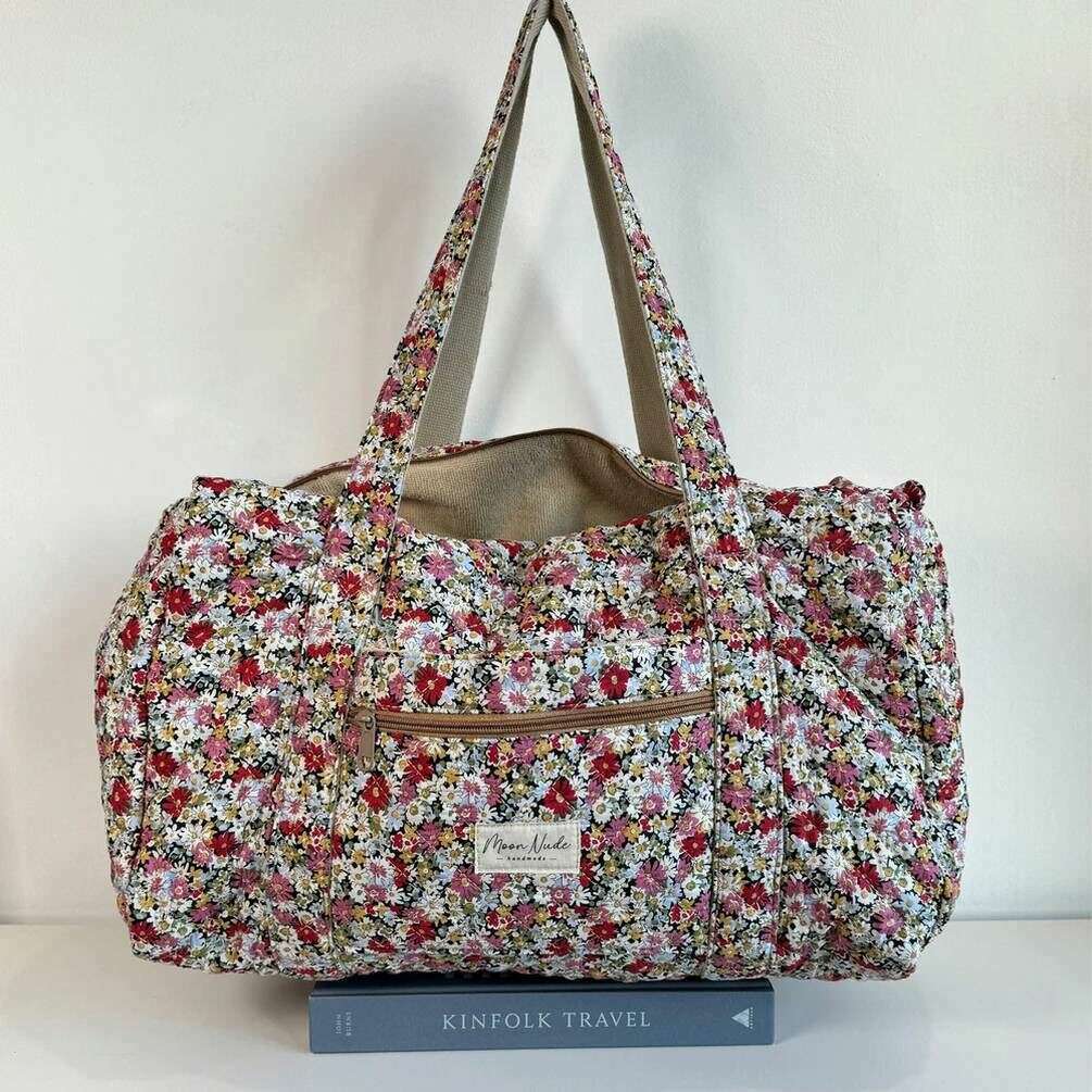 Introducing this women's autumn large duffel bag by Moon Nude, it is manufactured from 100% cotton in a red/white/pink colour. It measures 30cm(height) x 50cm(width) x 28cm(depth). It is recommended to wash by hand in cold water with a mild detergent, or maching wash inside out on a delicate cycle. to keep this bag in good condition. All the bags come complete with moon nude packaging. The Moon Nude Autumn Large Duffel Bag - Red/White/Pink features a beautiful handmade quilted design. This bag features an exterior zip pocket, a spacious interior and two large handles, perfect for weekend getaways or carrying lots of belongings.