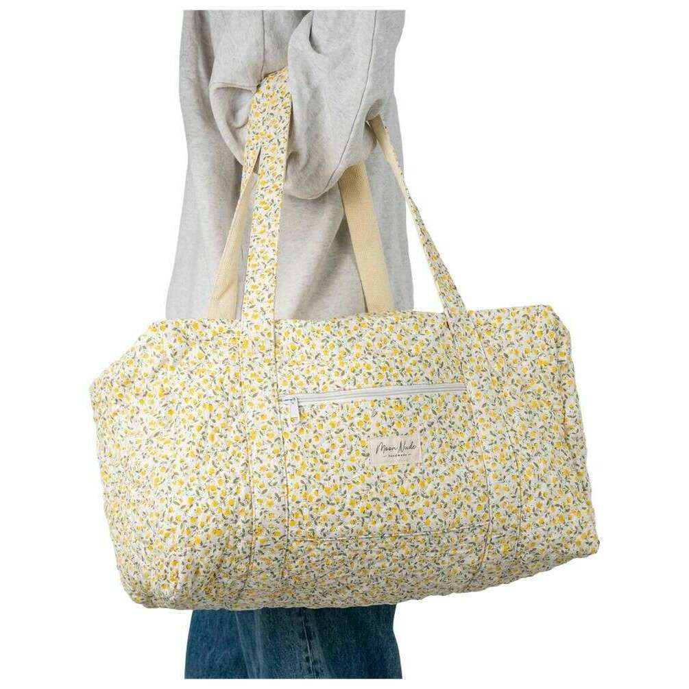 This well made women's buttercup large duffel bag from Moon Nude comes in a white/yellow/beige colour and is manufactured from 100% cotton. It measures 30cm(height) x 50cm(width) x 28cm(depth). It is recommended to wash by hand in cold water with a mild detergent, or maching wash inside out on a delicate cycle. to keep this bag in good condition. All the bags come complete with moon nude packaging. The Moon Nude Buttercup Large Duffel Bag - White/Yellow/Beige features a beautiful handmade quilted design. This bag features an exterior zip pocket, a spacious interior and two large handles, perfect for weekend getaways or carrying lots of belongings.