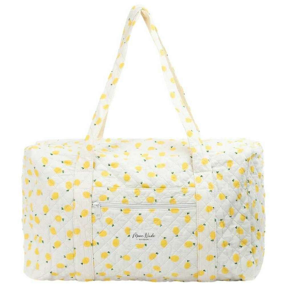 Perfect for women is this Moon Nude white/yellow lemonade large duffel bag, it is also made from 100% cotton. It measures 30cm(height) x 50cm(width) x 28cm(depth). It is recommended to wash by hand in cold water with a mild detergent, or maching wash inside out on a delicate cycle. to keep this bag in good condition. All the bags come complete with moon nude packaging. The Moon Nude Lemonade Large Duffel Bag - White/Yellow features a beautiful handmade quilted design. This bag features an exterior zip pocket, a spacious interior and two large handles, perfect for weekend getaways or carrying lots of belongings.