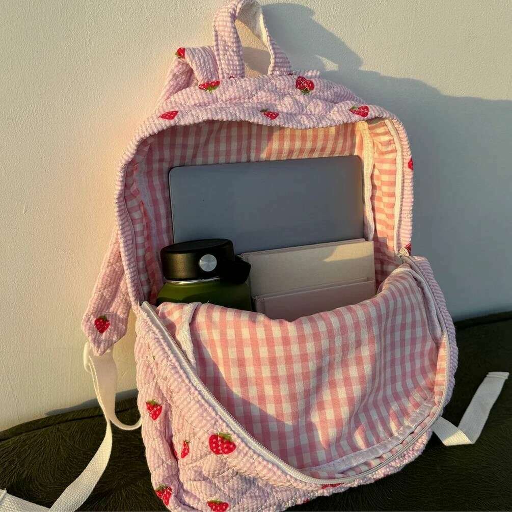 This women's strawberry backpack has been made from 100% cotton, featured in a pink colour and is from the brand Moon Nude. It measures 40cm(height) x 28cm(width) x 13cm(depth). It is recommended to wash by hand in cold water with a mild detergent, or maching wash inside out on a delicate cycle. to keep this bag in good condition. All the bags come complete with moon nude packaging. The Moon Nude Strawberry Backpack - Pink/Red features a beautiful handmade quilted design. Perfect for on the go, whether that s for work or everyday use. This bag has an exterior pocket with zip, perfect for any bits and bobs you may have. The interior is spacious and offers a back compartment for your laptop or tablet.