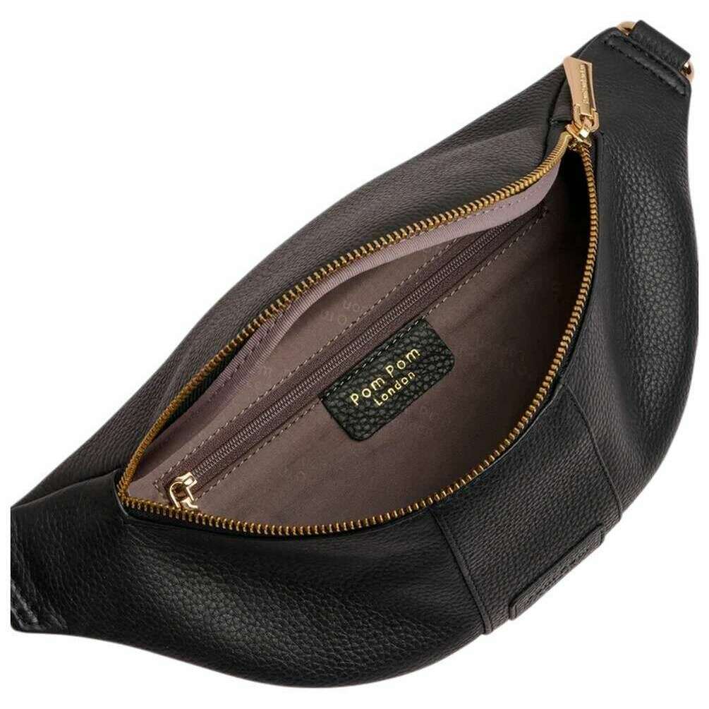 Brought to you by the brand Pom Pom London, this black women's bum bag is made from 100% full-grain leather. It measures 12cm(height) x 33cm(width) x 11cm(depth). All the bags come complete with pom pom london packaging. The Pom Pom London Bum Bag - Black is designed for anyone seeking a stylish, hands?free option that doesn t compromise on elegance. Its sleek silhouette and modern appeal make it the perfect accessory for days on the move, travel adventures, or everyday errands. Crafted from full?grain leather, it delivers both durability and a luxurious finish. The bag features a versatile nylon strap that can be adjusted for a comfortable and personalised fit, whether worn around the waist or styled crossbody. For practical organisation, it includes a separate external zipped compartment that provides quick access to essentials, as well as an internal zip pocket designed to keep valuables secure and neatly arranged. Finishing the look, Pom Pom London s signature gold hardware adds a touch of iconic elegance that elevates this everyday essential.