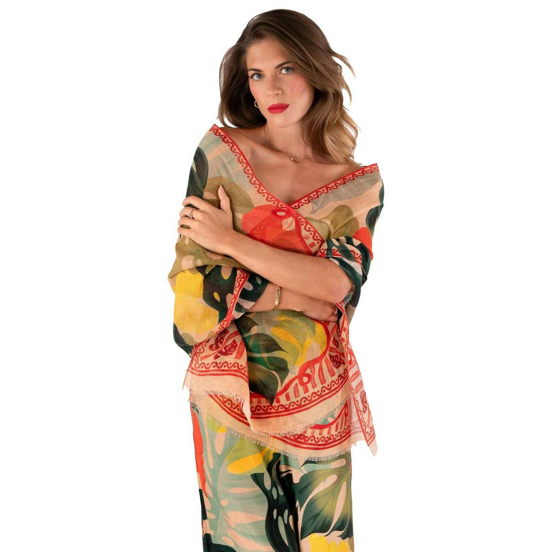 Powder Exotic Leaves Linen Cotton Scarf - Beige/Red/Blue
