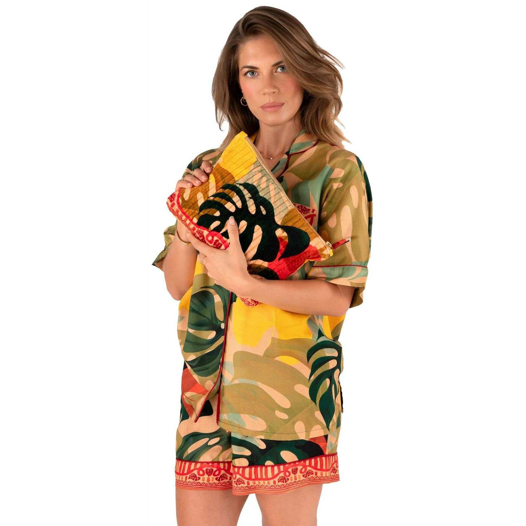 Powder Exotic Leaves Quilted Velvet Zip Pouch - Beige/Red/Black