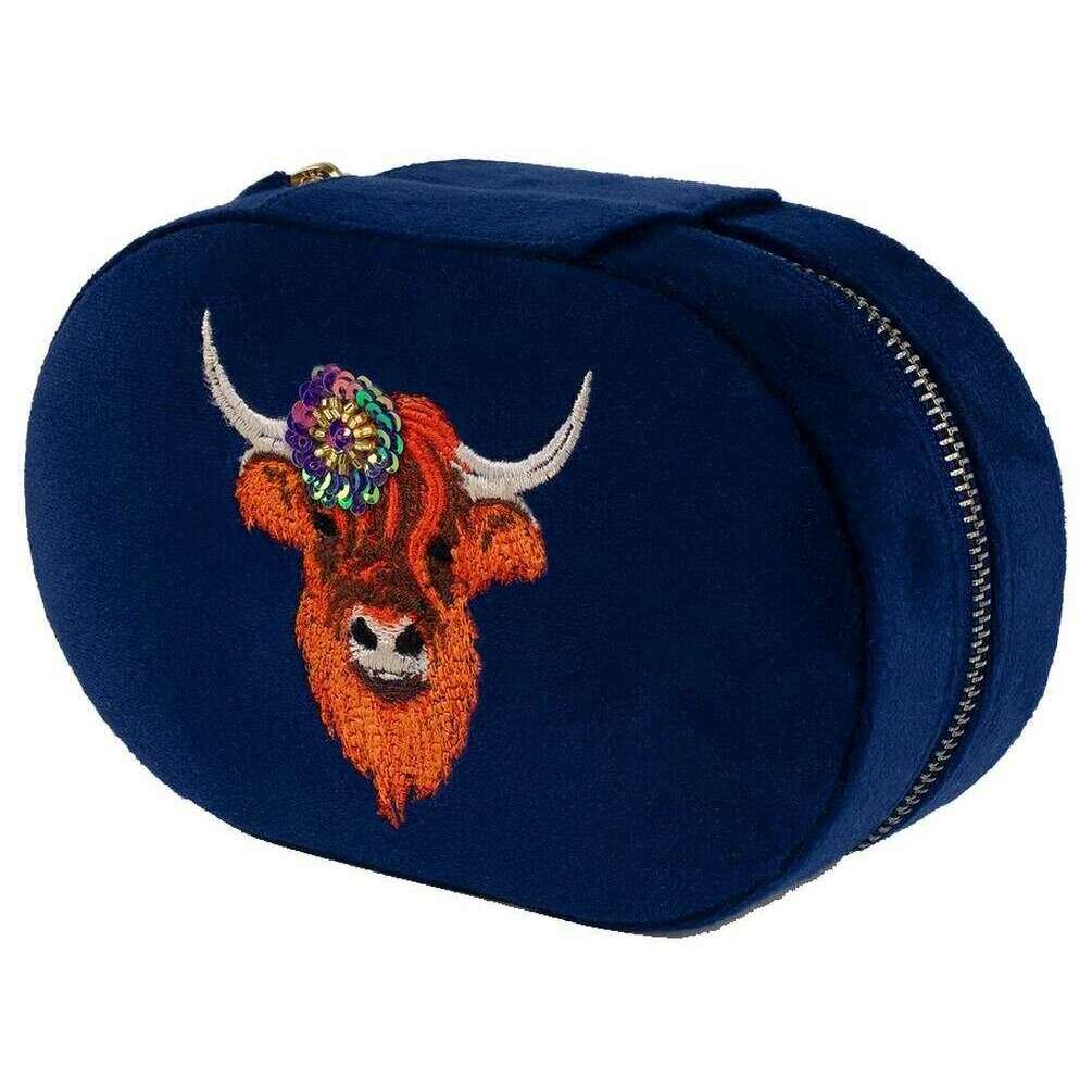 Powder Highland Cow Oval Jewellery Box - Navy Blue/Orange/Beige