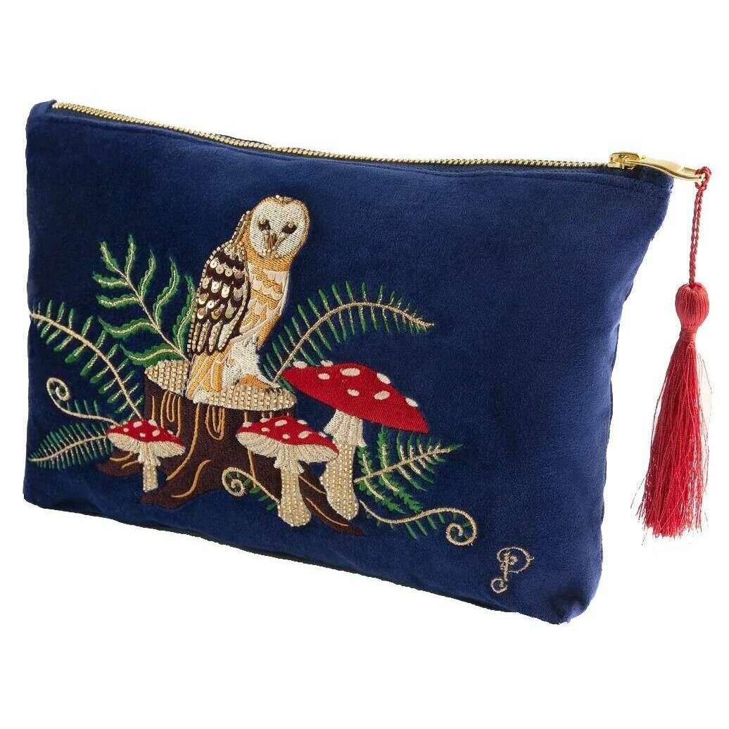 Powder Woodland Owl Velvet Zip Pouch - Navy