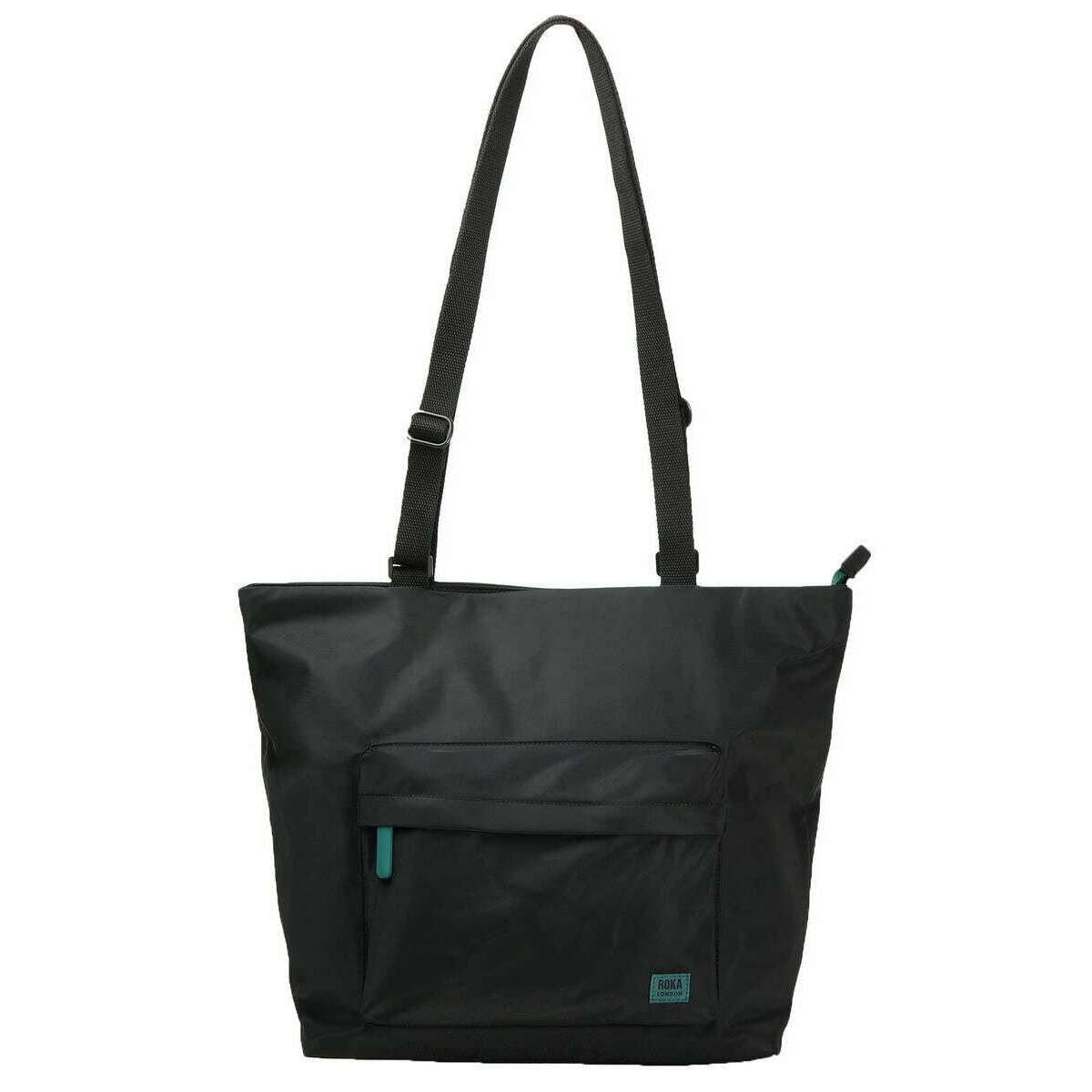 This trafalgar b all black recycled nylon tote bag for men or women is fashioned by the brand Roka in a black colour and is made from 100% weather resistant recycled nylon (triple coated). It measures 45cm(height) x 37cm(width) x 9.5cm(depth). All the bags come complete with roka packaging. The Roka Trafalgar B All Black Recycled Nylon Tote Bag - Black/Teal is a stylish tote bag that is essential to add to your everyday style. Designed to organise all of your day-to-day necessities it is equipped with a laptop pocket, internal water bottle compartment and secure zipped pockets throughout for your smaller, more valuable items. Crafted from sustainable, weather resistant materials which offer a vegan friendly finish, this tote is a must have for all. Carry it at your side or tossed over your shoulder with its comfortable and durable webbed straps which can be adjusted to the desired length. The all black design with the contrasting zips and labels gives this backpack and edgy look.