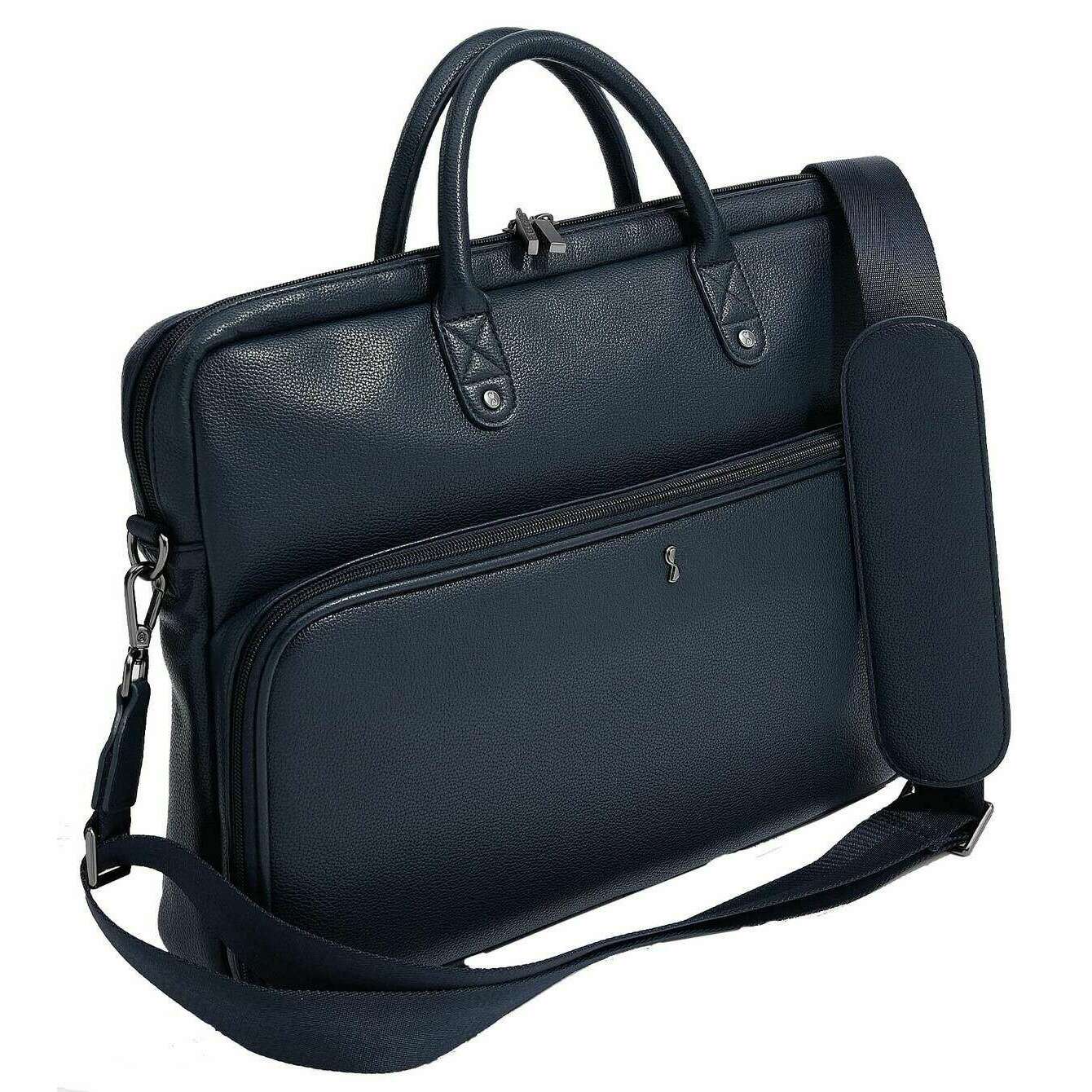 Manufactured from faux leather is this navy blue women's 16inch laptop bag by the designer Stackers. It measures 37cm(height) x 9cm(width) x 43cm(depth). All the bags come complete with stackers packaging. The Stackers 16inch Laptop Bag - Navy Blue is a must have when on the go! This classy blue laptop bag features stationary space, multiple pockets and a large external back pocket. Perfect for everyday use with its crossbody strap.