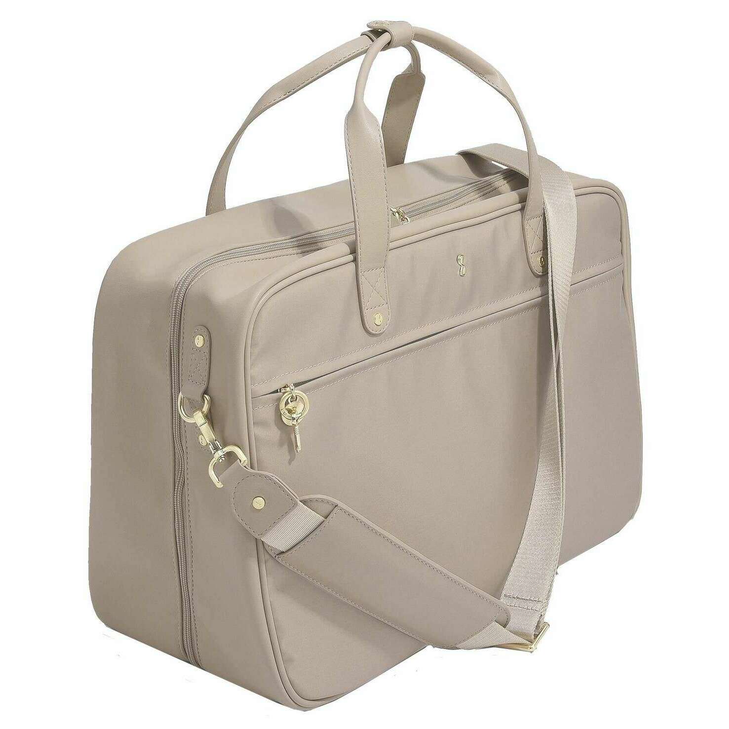 Using beige faux leather and velvet, this cabin bag by Stackers is perfect for women and a must have. It measures 33.5cm(height) x 22.5cm(width) x 46cm(depth). All the bags come complete with stackers packaging. The Stackers Cabin Bag - Clay Beige is perfect for on the go use. This beige cabin bags features a laptop pocket, two large zipped compartments and a range of smaller pockets. Complete with shoulder straps, backpack straps and a zip for added security.