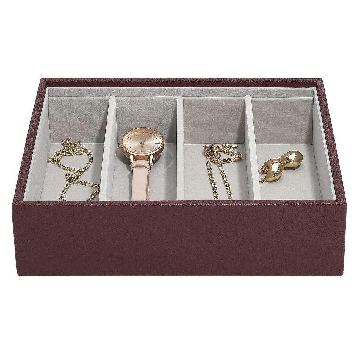 This women's classic glasses accessory layer by the brand Stackers is made from faux leather and velvet and is showcased in burgundy. It measures 6cm(height) x 25cm(width) x 18cm(depth). All the jewellery boxes come complete with stackers packaging. The Stackers Classic Glasses Accessory Layer - Burgundy features four bigger sections for any of your larger jewellery items. This beautiful burgundy jewellery layer is perfect for storing bigger items like sunglasses, watches and bangles.