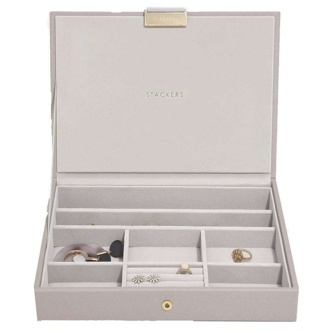 This classic jewellery box lid for women is fashioned by the brand Stackers in a grey colour and is made from faux leather and velvet. It measures 4.7cm(height) x 25cm(width) x 18cm(depth). All the jewellery boxes come complete with stackers packaging. The Stackers Classic Jewellery Box Lid - Taupe features a beautiful woven taupe design. This jewellery box lid is perfect for storing all your jewellery items! Comes complete with multiple sized sections for rings, earrings, bracelets and necklaces.