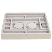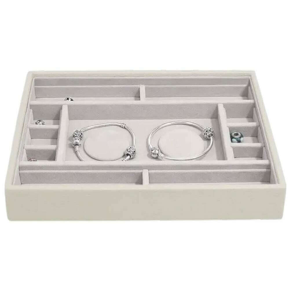 Using cream faux leather and velvet, this classic multi-bracelet layer by Stackers is perfect for women and a must have. It measures 3.7cm(height) x 25cm(width) x 18cm(depth). It is recommended to wipe clean to keep this jewellery box in good condition. All the jewellery boxes come complete with stackers packaging. The Stackers Classic Multi-Bracelet Layer - Oatmeal Cream features 2 bracelet pads to store completed charm bracelets as well as multiple compartments for any extra charms. The side sections have been designed to fit 4 short charm bars or 2 long charms bars with the dividers removed. This tray can be added to other layers to create the perfect jewellery box or used on its own.