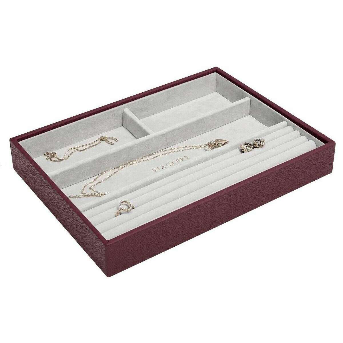 Perfect for women is this Stackers burgundy classic ring bracelet layer, it is also made from faux leather and velvet. It measures 3.7cm(height) x 25cm(width) x 18cm(depth). All the jewellery boxes come complete with stackers packaging. The Stackers Classic Ring Bracelet Layer - Burgundy features multiple sections for all your rings and bracelets. This beautiful classic burgundy jewellery layer is perfect for keeping organised!