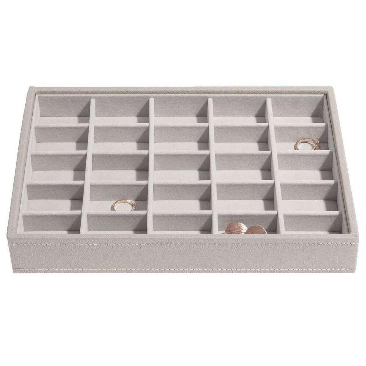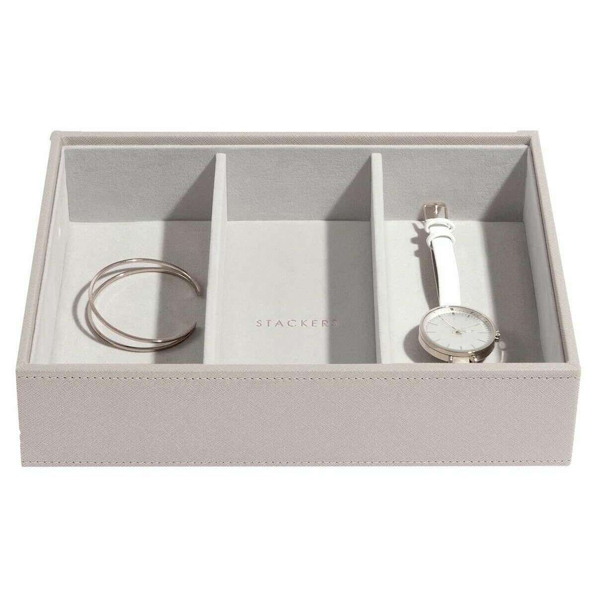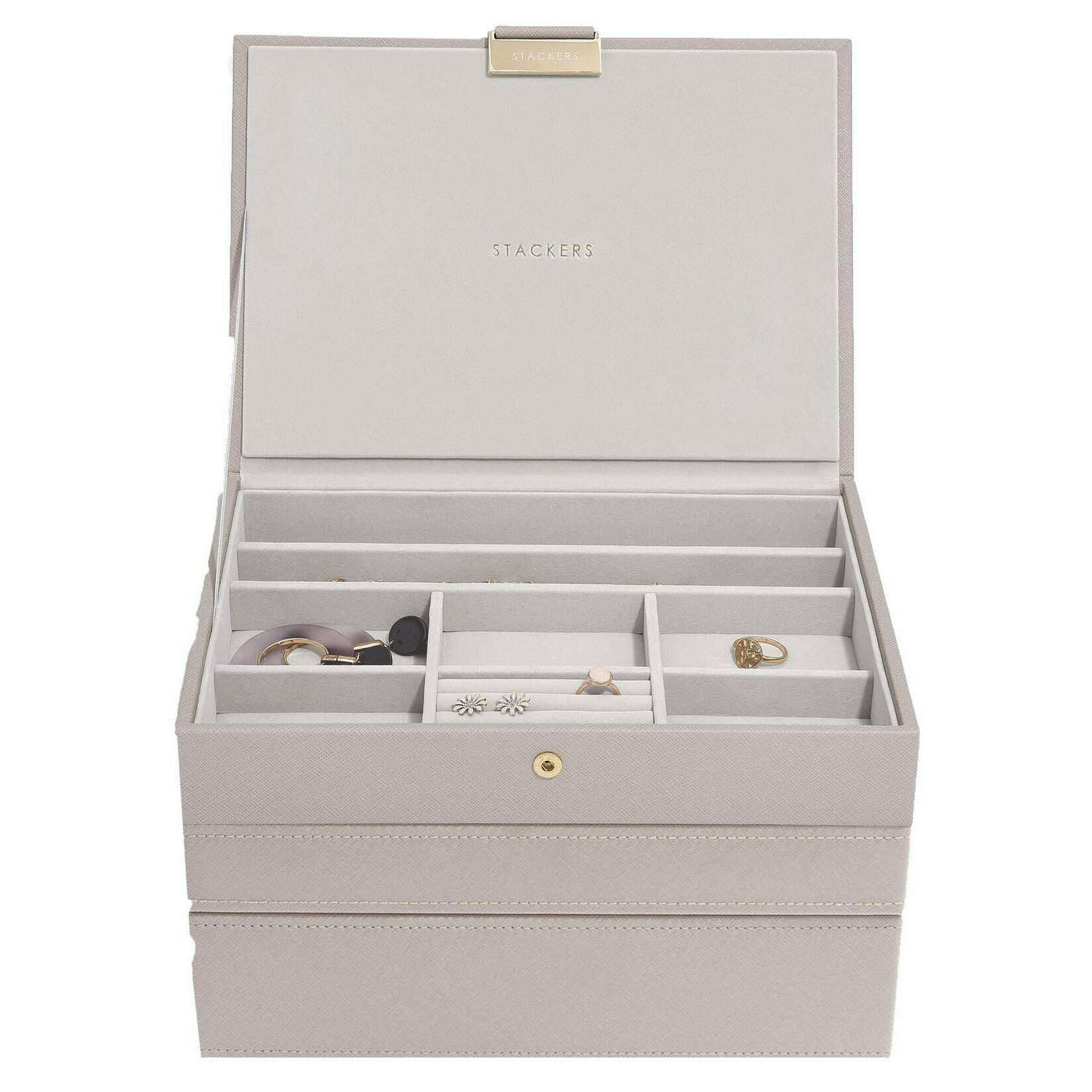 This well made women's classic set of 3 jewellery box from Stackers comes in a taupe raffia colour and is manufactured from faux leather and velvet. It measures 13.7cm(height) x 25cm(width) x 18cm(depth). All the jewellery boxes come complete with stackers packaging. The Stackers Classic Set of 3 Jewellery Box - Taupe Raffia features a unique taupe raffia jewellery box design. This jewellery box is perfect for storing all your jewellery items! Comes complete with three layers and multiple sized sections for earrings, rings and bracelets and a larger section for watches and bangles.