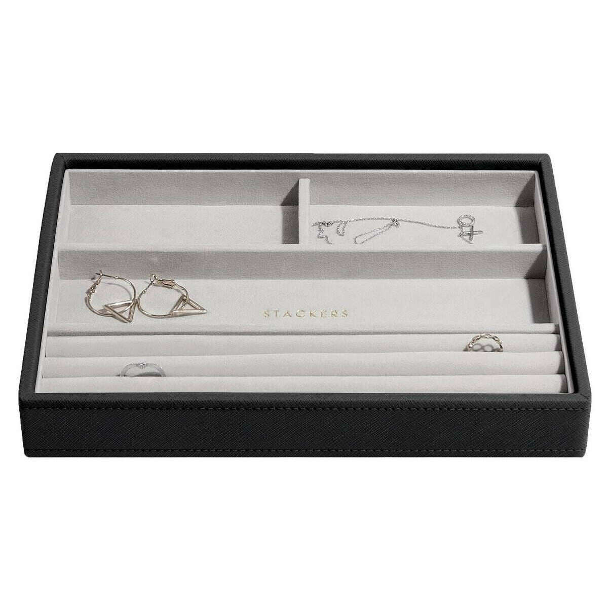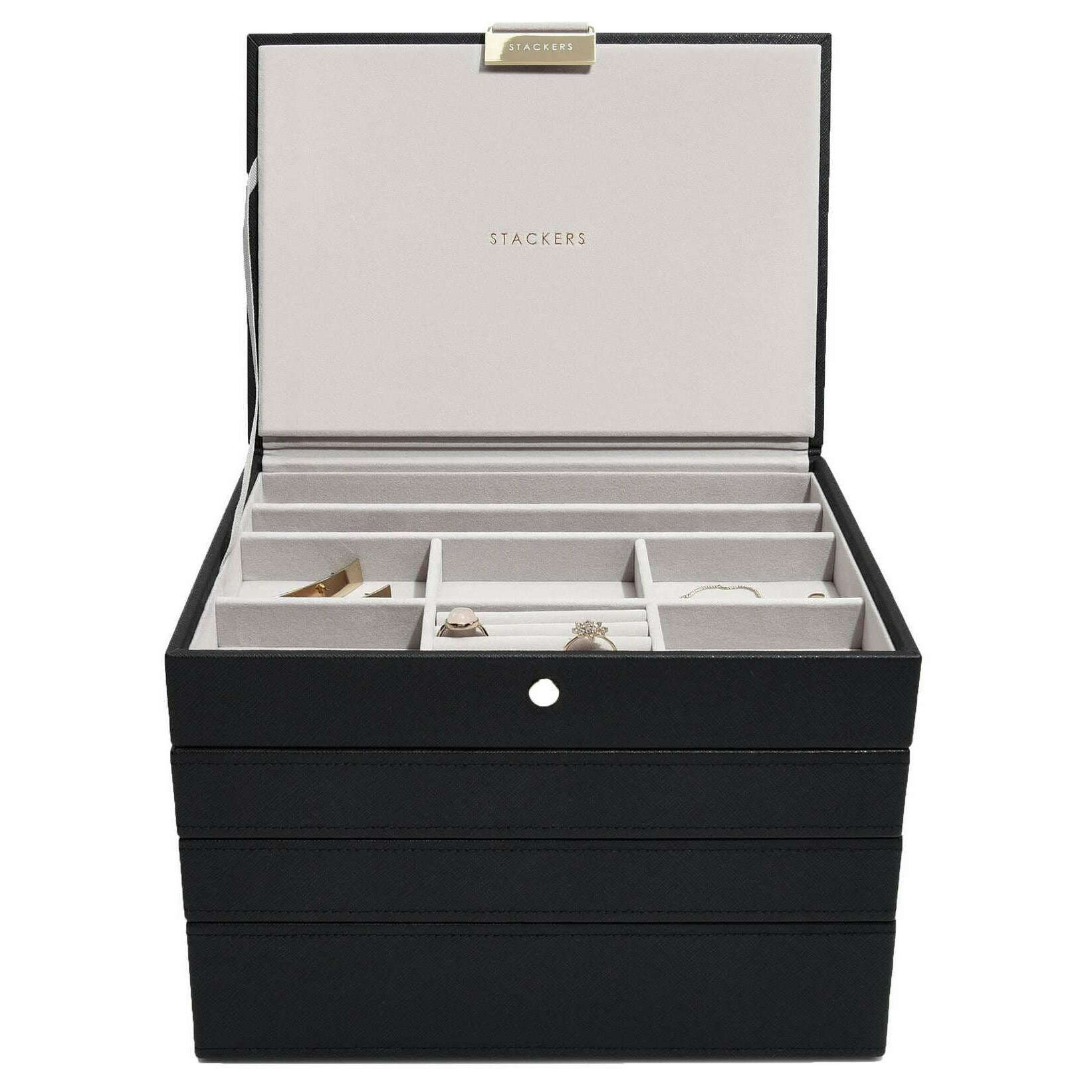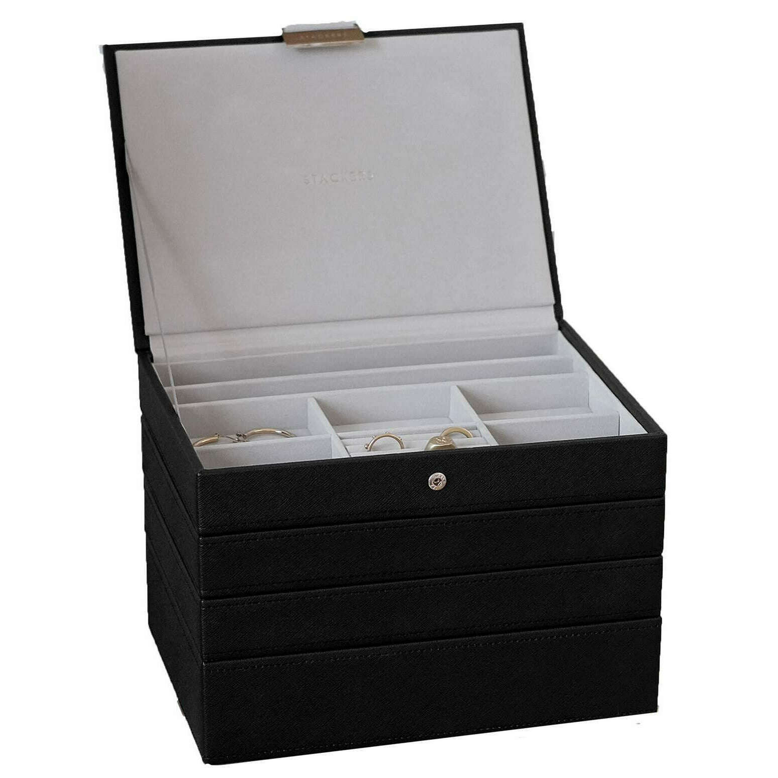 Introducing this women's classic set of 4 jewellery box by Stackers, it is manufactured from faux leather and velvet in a black raffia colour. It measures 19.5cm(height) x 25cm(width) x 18cm(depth). All the jewellery boxes come complete with stackers packaging. The Stackers Classic Set of 4 Jewellery Box - Black Raffia features a unique black raffia jewellery box design. This jewellery box is perfect for storing all your jewellery items! Comes complete with four layers and multiple sized sections for earrings, rings and bracelets and a larger section for watches and bangles.