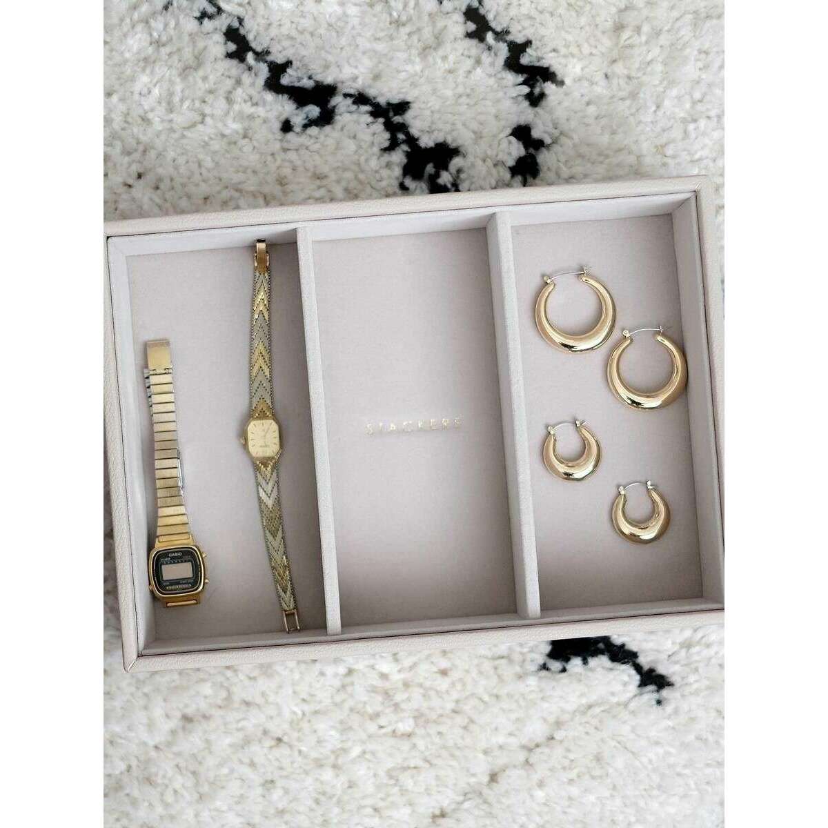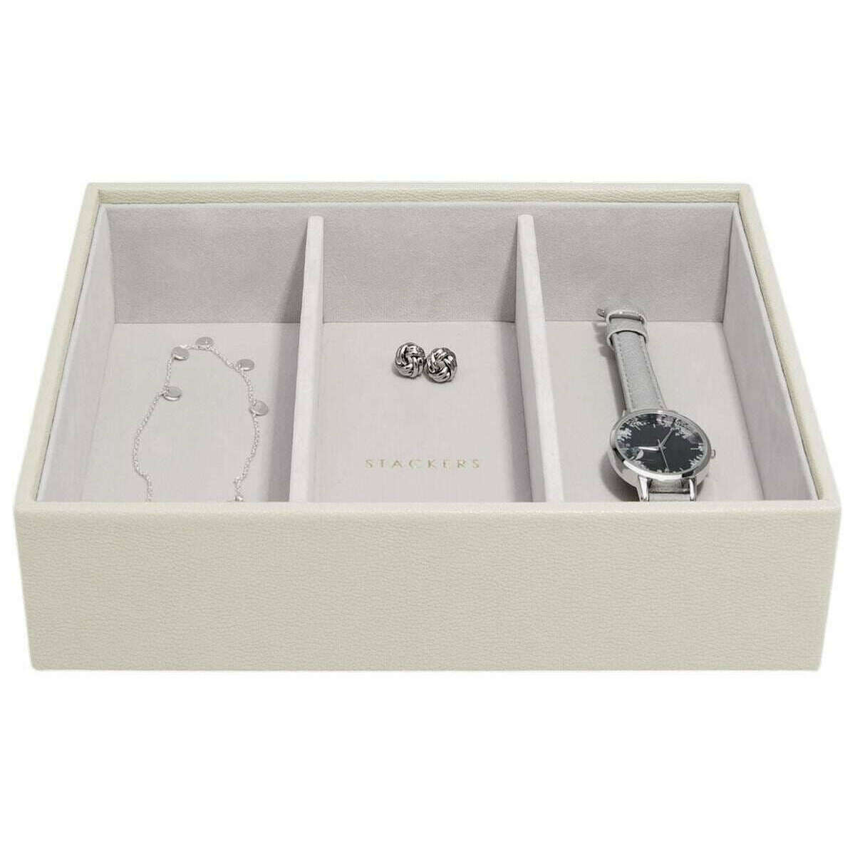 This well made women's classic watch accessory layer from Stackers comes in a oatmeal cream colour and is manufactured from faux leather and velvet. It measures 6cm(height) x 25cm(width) x 18cm(depth). It is recommended to wipe clean to keep this jewellery box in good condition. All the jewellery boxes come complete with stackers packaging. The Stackers Classic Watch Accessory Layer - Oatmeal Cream is perfect for storing glasses and larger accessories and can be used as in-drawer storage or stacked with other layers from the Stackers collection to create a custom jewellery box. Ideal for women who love to accessorise, this lovely layer looks elegant and smart and has been professionally crafted from high quality materials.