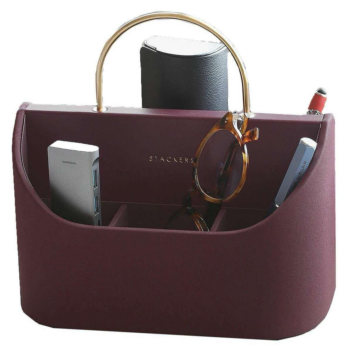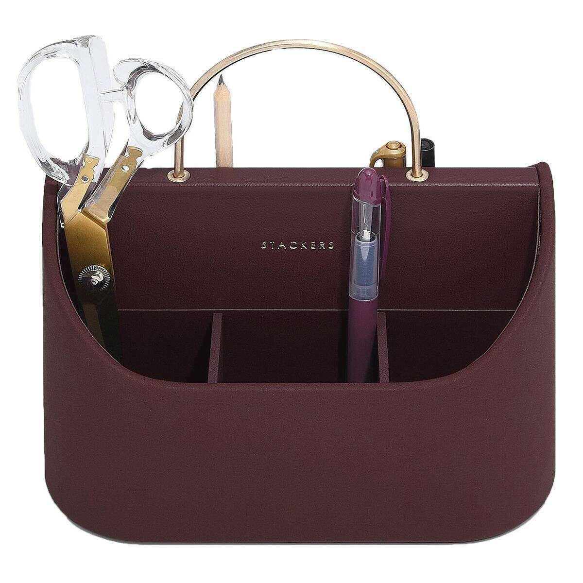 Introducing this women's desk caddy by Stackers, it is manufactured from faux leather in a garnet burgundy colour. It measures 21cm(height) x 21cm(width) x 13cm(depth). All the desk accessories come complete with stackers packaging. The Stackers Desk Caddy - Garnet Burgundy is a must have for any desk! This burgundy desk caddy is perfect for storing stationary and even has a handle which makes it easily portable.