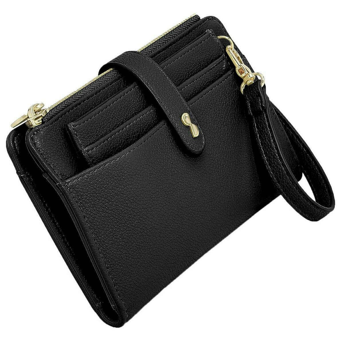This women's large purse has been made from faux leather, featured in a black colour and is from the brand Stackers. It measures 12.5cm(height) x 19.5cm(width) x 3cm(depth). All the purses come complete with stackers packaging. The Stackers Large Purse - Black is a must have when on the go! This classic and trendy black purse features multiple pockets for money and cards, a removable card purse and a cosmetic mirror. Comes complete with a removable wrist strap and external phone pocket. Perfect for any outing!