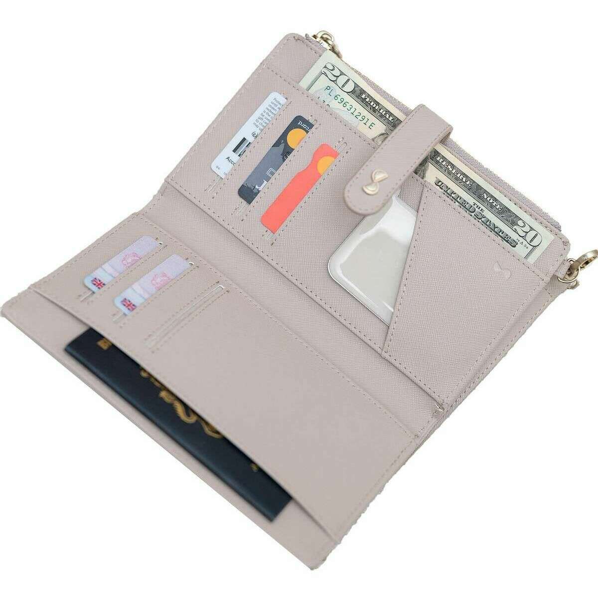 • External Phone Pocket , 6 Card Slots , Cosmetic Mirror , Removable Zipped Coin Pocket , Removable Wrist Strap , Popper Fastening