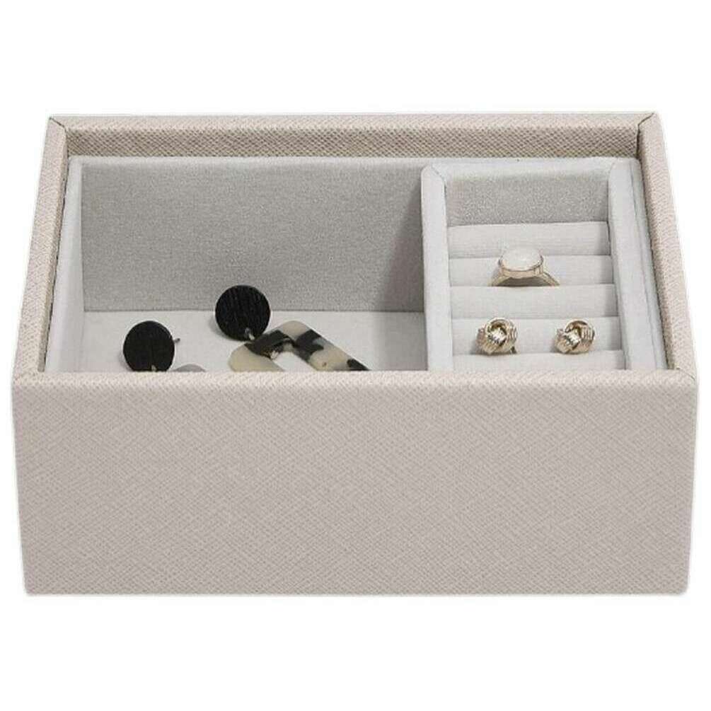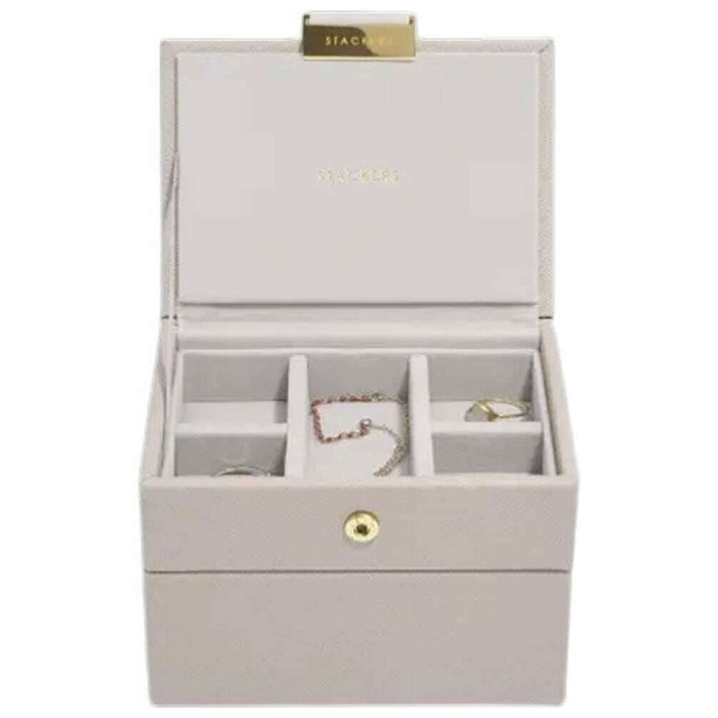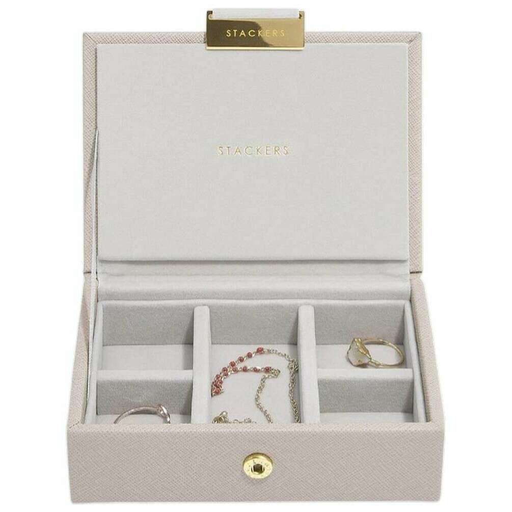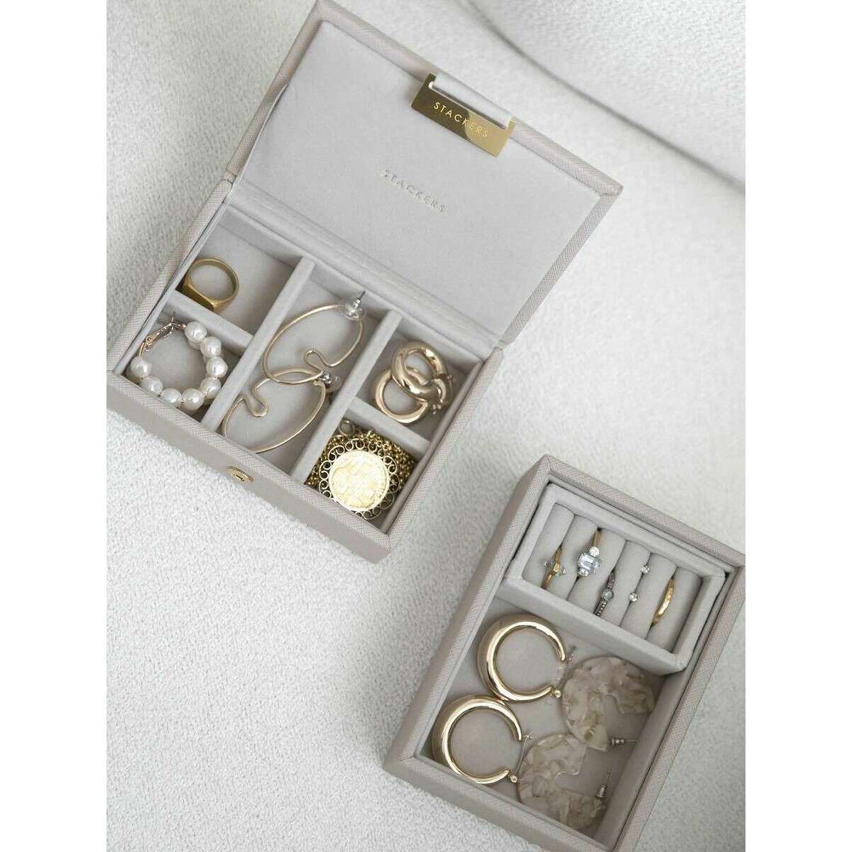 This women's micro jewellery box by the brand Stackers is made from faux leather and velvet and is showcased in beige. It measures 9cm(height) x 12.5cm(width) x 9cm(depth). It is recommended to wipe clean to keep this jewellery box in good condition. All the jewellery boxes come complete with stackers packaging. The Stackers Micro Jewellery Box - Taupe Beige will be the perfect companion when you are on your travels, or just something you keep on your nightstand to hold your favourite pieces you wear from day-to-day. The lidded layer features 4 small square sections and one rectangular section down the middle. The base layer offers a ring roll and one deep section which is great for slightly chunkier items. This would make the perfect gift.
