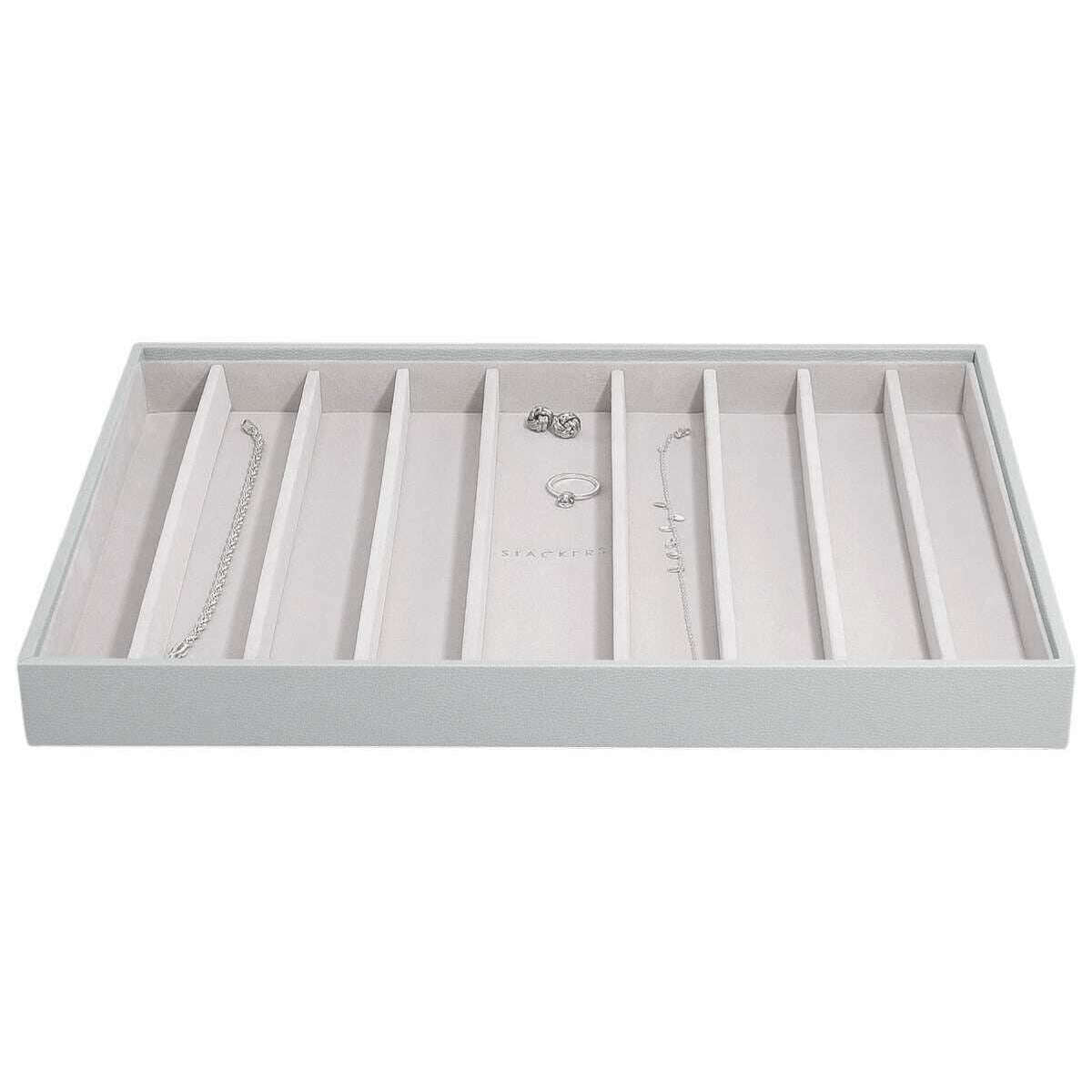 Manufactured from faux leather and velvet is this pebble grey women's supersize necklace layer by the designer Stackers. It measures 4cm(height) x 36cm(width) x 23.9cm(depth). It is recommended to wipe clean to keep this jewellery box in good condition. All the jewellery boxes come complete with stackers packaging. The Stackers Supersize Necklace Layer - Pebble Grey has been designed to keep your necklaces organised and tangle free. With a soft velvet interior, this will be certain to impress those who have lots of jewellery to organise and keep safe from getting damaged. This is perfect to keep on your chest of drawers or dresser due to its simple design making it go with any room, or it can be combined with other supersize layers to create your perfect jewellery box.