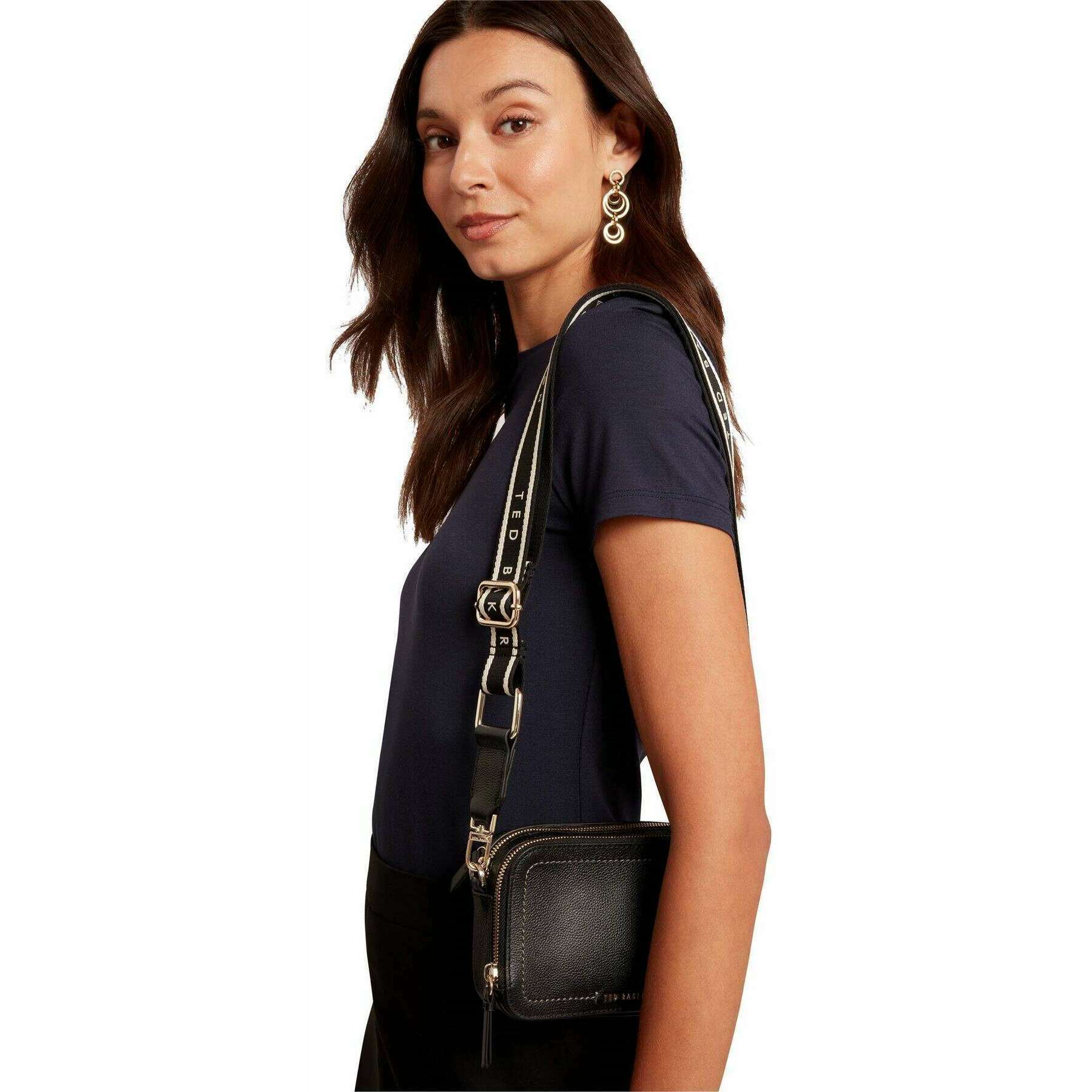 This women's linzie webbing leather small crossbody camera bag by the brand Ted Baker is made from 100% bovine leather and is showcased in black. It measures 11cm(height) x 17cm(width) x 5cm(depth). All the bags come complete with ted baker dust bag. The Ted Baker Linzie Webbing Leather Small Crossbody Camera Bag - Black is a stunning hands-free bag to ensure comfort and practicality. The double zip compartments, the internal side pocket and external back pocket allows extra storage to ensure all of your essential items are with you on the go. This stunning design features the signature logo, stitch detailing on the front and gold hardware. The detachable adjustable strap is co-ordinated with the colours featured on the bag itself allowing you it to match your outfits perfectly.