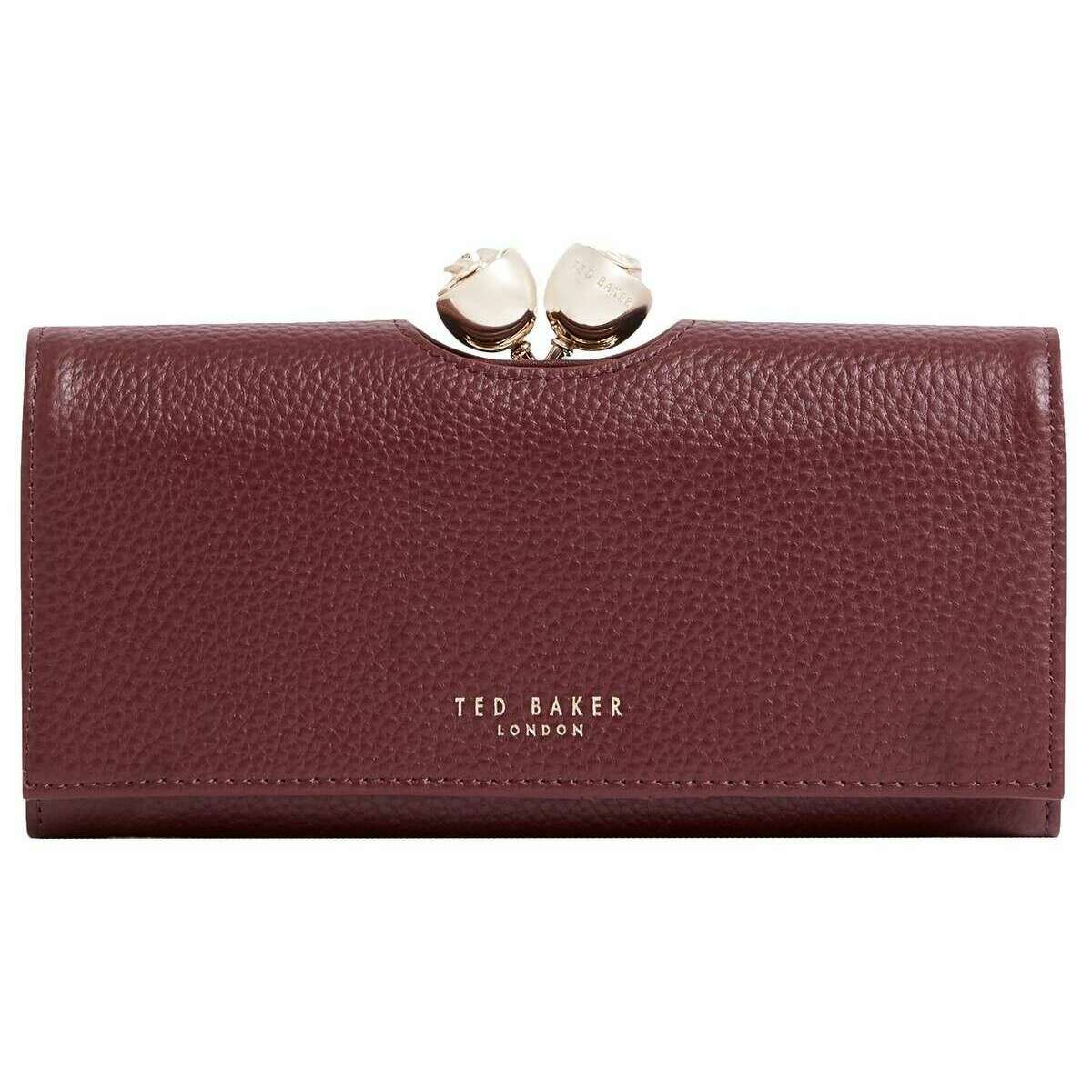 This well made women's roosali rose detail large leather bobble purse from Ted Baker comes in a wine burgundy colour and is manufactured from 100% bovine leather. It measures 9cm(height) x 14.5cm(width) x 3cm(depth). All the purses come complete in a ted baker gift box. The Ted Baker Roosali Rose Detail Large Leather Bobble Purse - Wine Burgundy has been beautifully crafted to provide sophistication and elegance while organising your cards and cash effortlessly. A standout to this purse are the gorgeous rose bud clasps which offer feminine flair to a simple silhouette. Finished with branding on the front, this purse would make the perfect treat to yourself or a thoughtful gift.