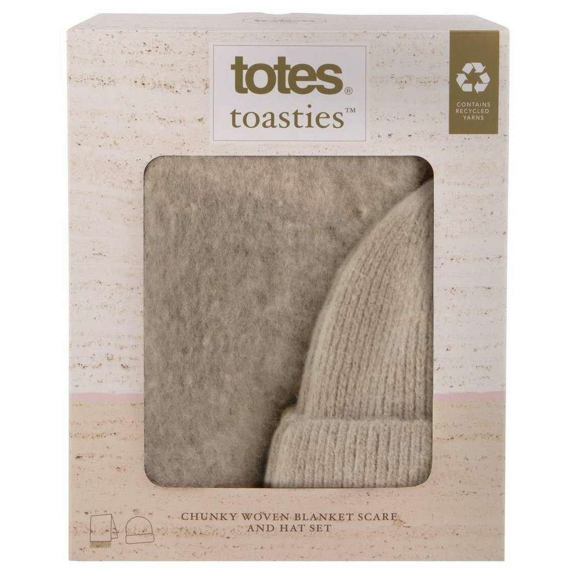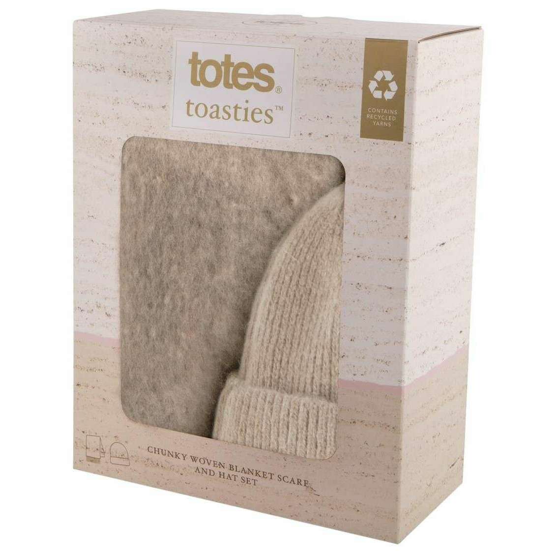 Totes Toasties Chunky Woven Blanket Scarf and Hat Set - Oat Cream/Grey